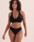 Dive into elegance with the Blue Coastal textured bralette bikini top, designed to flatter D cups! Its criss-cross design at the front accentuates your neckline, while the delicate ruching adds dimension. The textured fabric provides a light, comfortable feel, while the timeless black colour gives it a chic classic look.