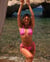 Sunbathing in style is art, and this tie-up bikini top is a true chameleon! It adapts to your mood thanks to adjustable ties at the neck and back, adorned with gold flower-shaped charms that add a sunny, playful touch. With no underwire, no lining, and no padding, it’s all about lightness and freedom, while still offering great support thanks to the double tie at the neck. Its pink and purple floral print is a breath of fresh air for your sun-filled days.