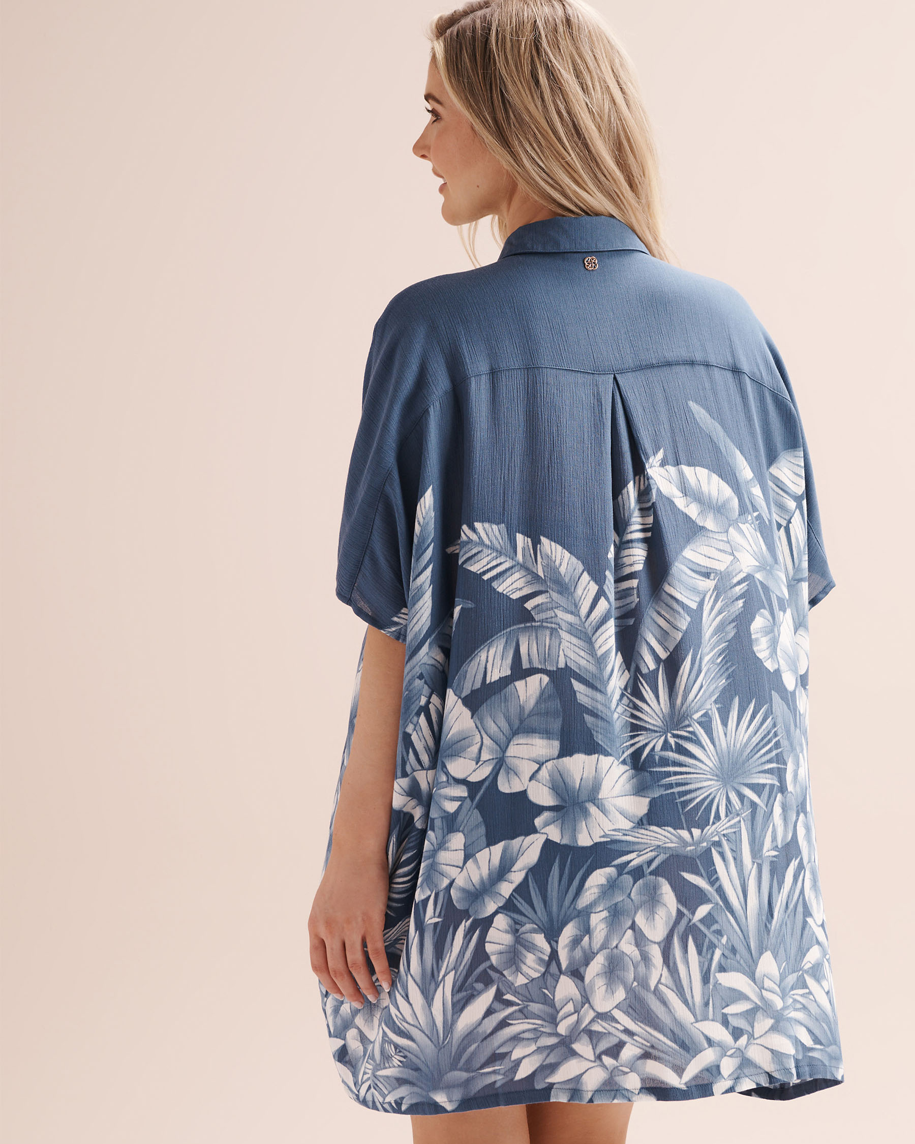 Here’s your new sunshine companion: a lightweight, textured caftan so easy to slip on, you’ll never want to take it off. Its white‑on‑blue foliage pattern adds a touch of exotic flair. With its shirt‑style cut and front button‑down design, it follows you effortlessly from the walk to the beach to the next‑day brunch.