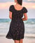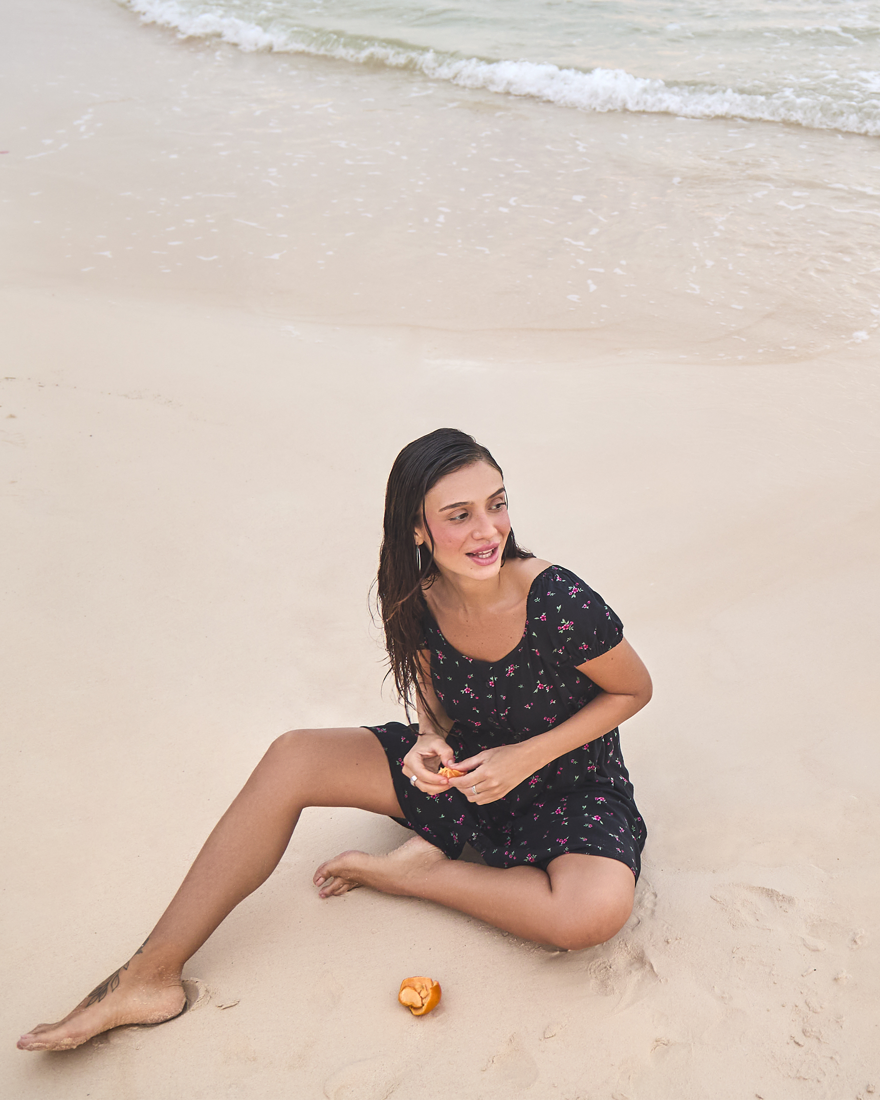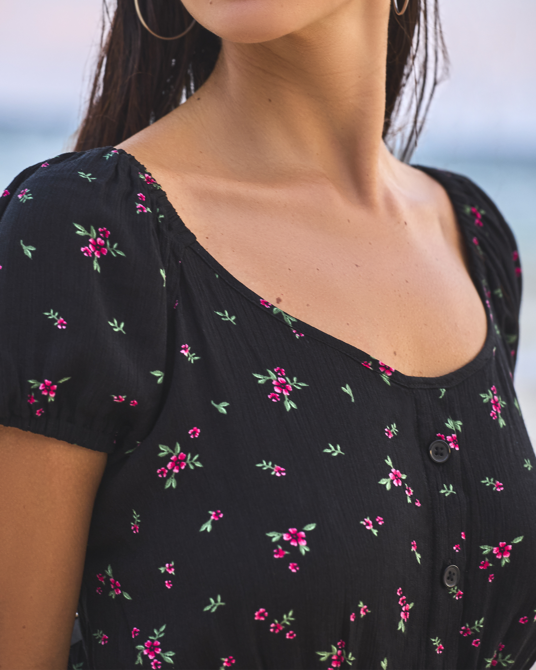 A little dress with a delicate floral print is the perfect choice to complete a charming beach outfit. The elastic at the sleeves keeps them comfortably in place, while the elastic waistband gives the silhouette a flattering shape. The front buttons add a trendy touch and the semi-transparent fabric is lightweight and breathable for warm, sunny days.