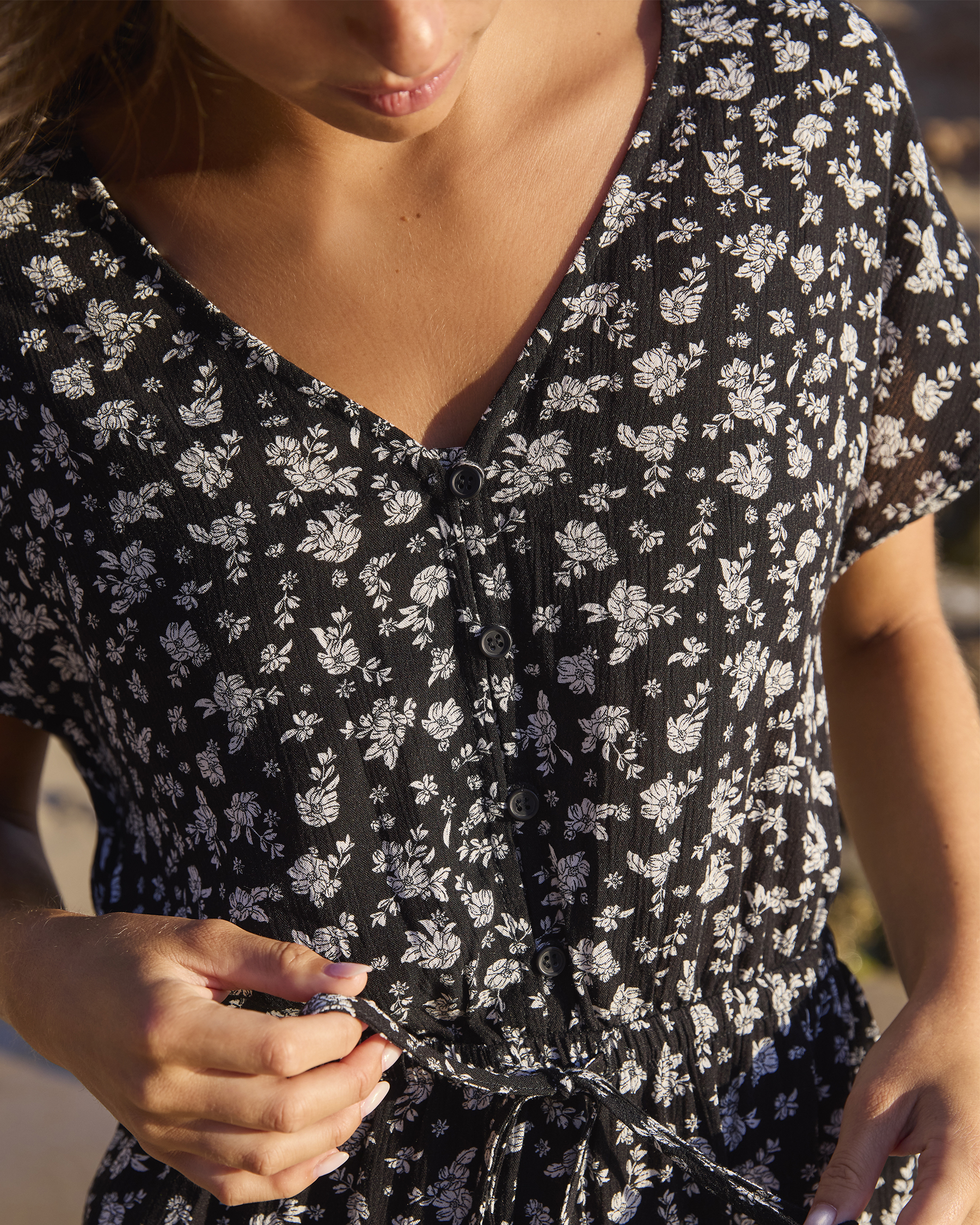 A pretty short floral dress for a chic yet casual touch.A pretty short floral dress for a chic yet casual touch. Its black and white floral print makes it perfect for sunny days and spontaneous outings. The V-neckline adds a feminine flair, while the elastic waist with adjustable drawstring ensures a comfortable and flattering fit. The button-down front brings a classic detail to this lightweight, easy-to-wear dress.