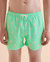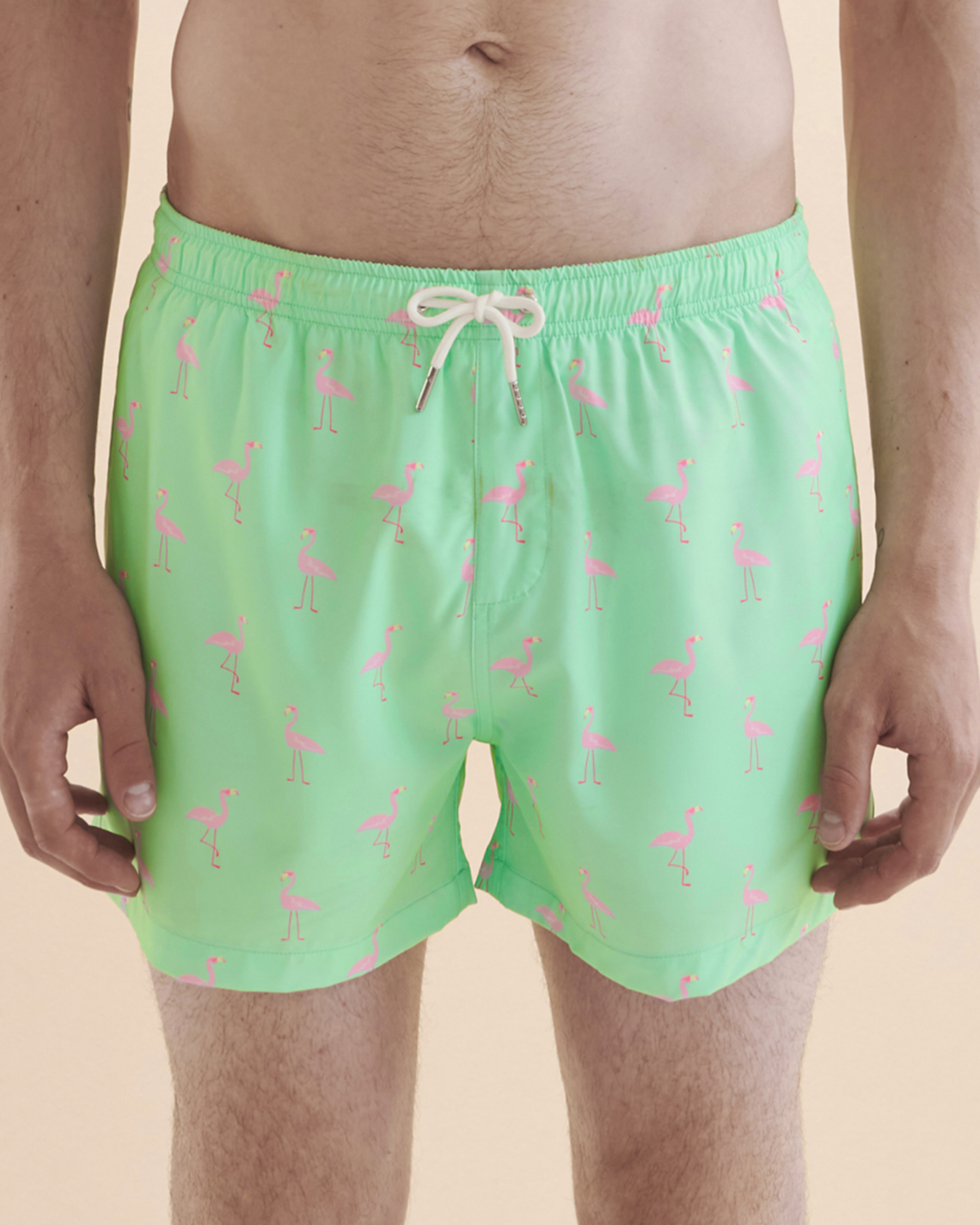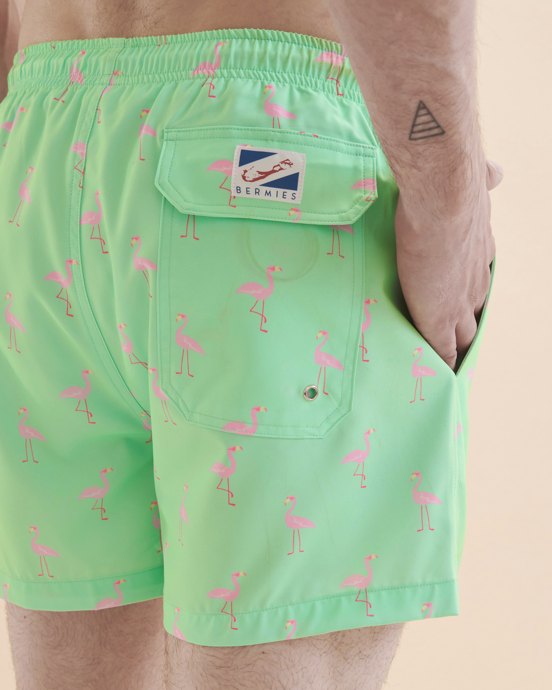Start your vacation off right with Bermies Green Flamingo Volley Swimsuit. This bright green patterned swimsuit is made of quick-dry 4-way stretch fabric that also provides UV protection. Its mesh lining and elastic waistband ensure all-day comfort. Made from recycled this swimsuit is an environmentally friendly choice!