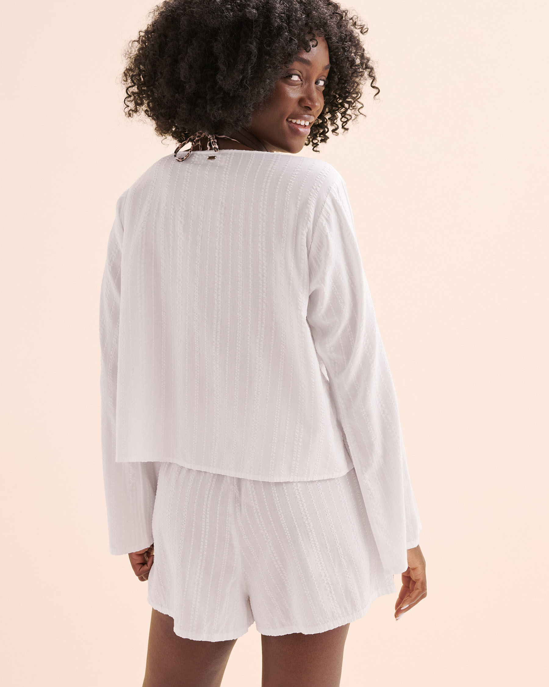 The subtle charm of details with its long sleeves and front tie closure, this top embodies lightness. Made from seersucker, it offers a delicate texture and a standard fit that moves naturally with the body. A simple yet essential piece, perfect for days when comfort and style go hand in hand.