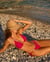 In a radiant red that will make hearts race, this triangle bikini top is pure glamour. Its textured lace with a foliage pattern exudes sophistication, while the asymmetrical golden ring at the front adds an irresistible touch of shine.