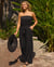 This black leaf-patterned jumpsuit is the perfect blend of casual and chic, ideal for a city stroll or a weekend getaway. The elastic bandeau top ensures a secure fit, while the twisted drawstring, adorned with golden square beads and playful tassels, adds a touch of elegance.