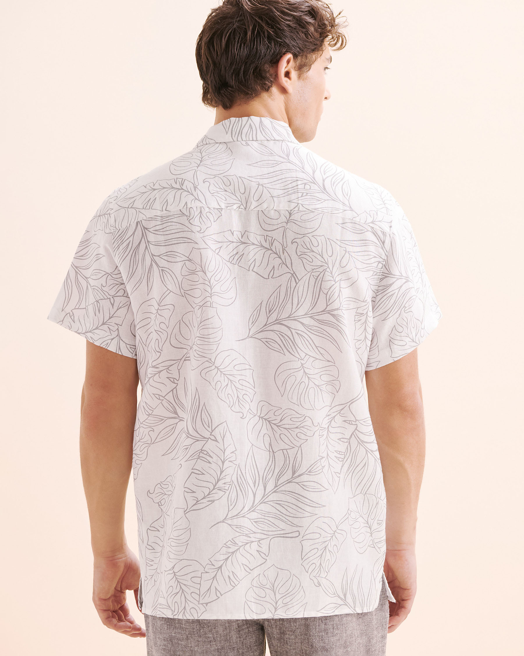 This short-sleeved shirt features a grey tropical print that evokes vacation vibes while remaining stylish. Made from a breathable blend of cotton and linen, it's perfect for warm days. The buttoned neckline, front closure and patch pocket offer the ideal details for all-day comfort.