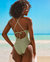 The MyBikiniStory Malibu Shiny One-Piece Swimsuit is the perfect combination of style and comfort. Made from shiny ribbed fabric, it gently hugs your curves and offers a luxurious texture that catches the light. The metal seashell charms at the ends of the front and back ties provide an elegant, refined detail. This swimsuit includes removable padding for adjustable support, along with light back coverage for a seductive yet comfortable look. The side ruching on the top adds a touch of sophistication, while the front and back openings bring a modern and daring edge to the design. Its plant green colour evokes nature and freshness, perfect for enhancing your tan and catching everyone's eye. Ideal for making a statement at the beach or pool, it embodies the pride, confidence, and beauty of every woman, creating a perfect balance between boldness and timeless elegance.