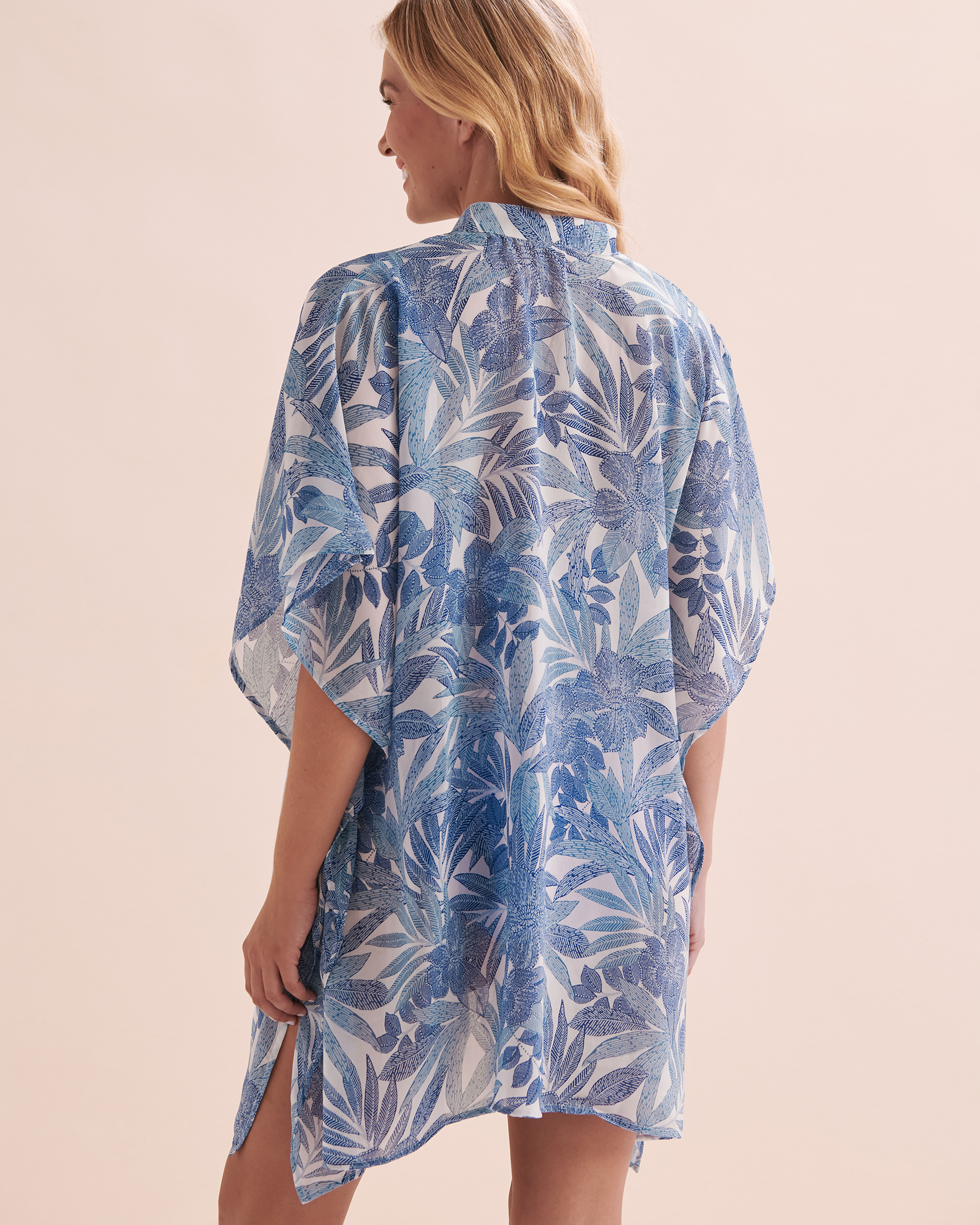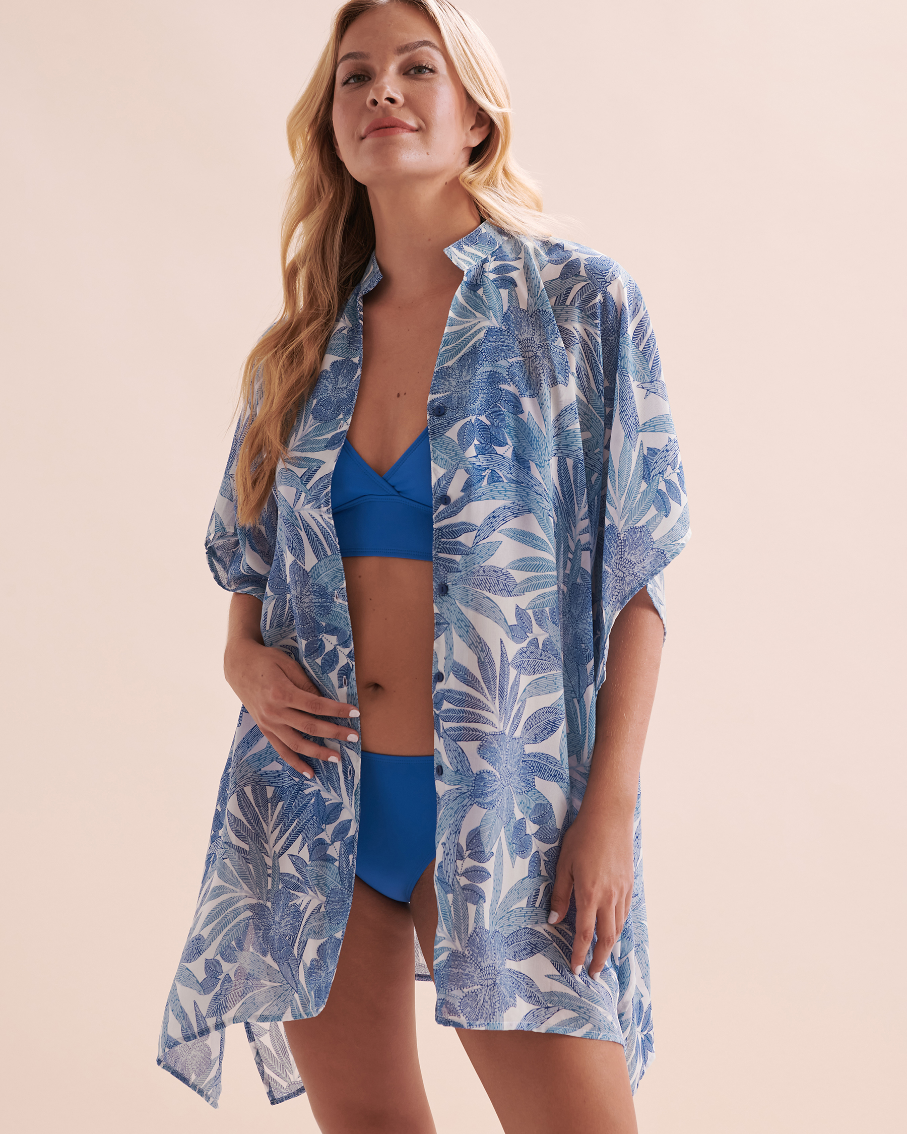Cover Me's Peach Chiffon Short Sleeve Button-down Shirt is the perfect beach accessory. This button-down short-sleeve shirt is decorated with a blue tropical print. Its front buttons are a beach classic as you can choose to wear the top open or closed. Perfect to throw over a bikini, or to wear to lunch, this top is not one you want to miss out on!