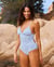 Elegant and practical, this unpadded one-piece swimsuit blends comfort with a feminine design. The removable padding provides customizable support, and the detailed back ties add a refined touch. The light back coverage and blue and white floral print create a flattering silhouette. This swimsuit is perfect for a day of relaxation by the water.