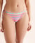 The Shimmer collection captivates with its horizontal stripes that echo the shifting colours of a coastal sky. The Brasilia bottom, meanwhile, is all about flattering curves with its delicately finished edges and strategic back ruching. Its cheeky coverage creates a sculpted look, while the dainty side rings and adjustable ties add a charming touch. A swim bottom designed to look stunning from every angle.