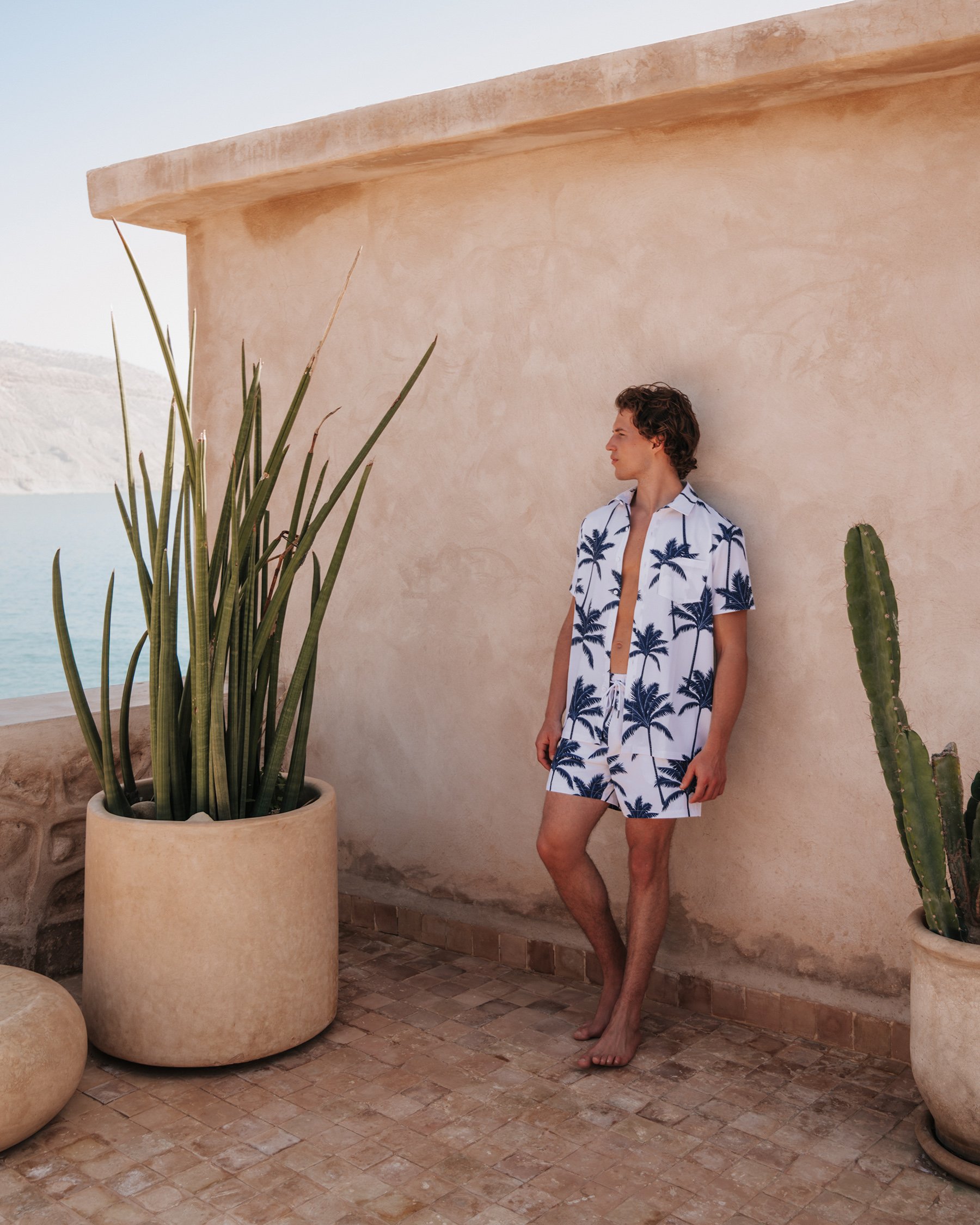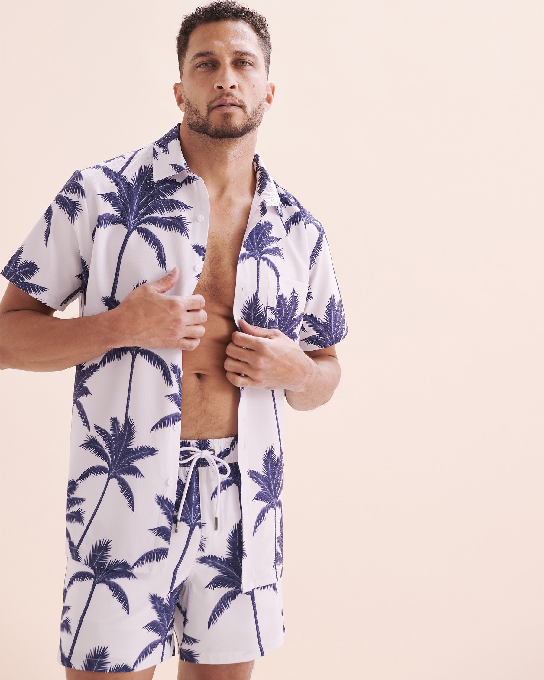 Tropical escape at your fingertips with Hamabe’s short-sleeve shirt. With its navy palm tree pattern, this relaxed piece instantly transports you to a sunny vibe. Its light seersucker fabric is perfect for warm days when comfort and freshness are a must.