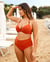 A push-up bikini top that fits your needs and desires! The Sunset in Portofino plunging push-up bikini top is the perfect piece to highlight your figure this summer. Featuring moulded cups and removable push-up pads, it provides optimal support while enhancing the bust for a daring plunging neckline. The criss-cross front design and underwire ensure a secure fit, while adding a touch of sophistication. The straps, accented with small rings and a tie-neck detail, are finished with logo charms for an elegant touch. The back has a hook closure for the perfect fit. In a warm paprika red shade, this top is a true statement of style, combining both comfort and glamour. Get ready to shine on the beach!