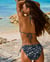A little gem of fun for all those who want to tan, move and laugh. This low-rise bikini bottom has everything it needs where it counts, with its bikini cut and full back coverage. Its black ribbed fabric adorned with a white tropical pattern and black-and-white striped outlines gives you a killer look. The side ties with open cutouts add just the right amount of pep to your silhouette for an effortless effect.