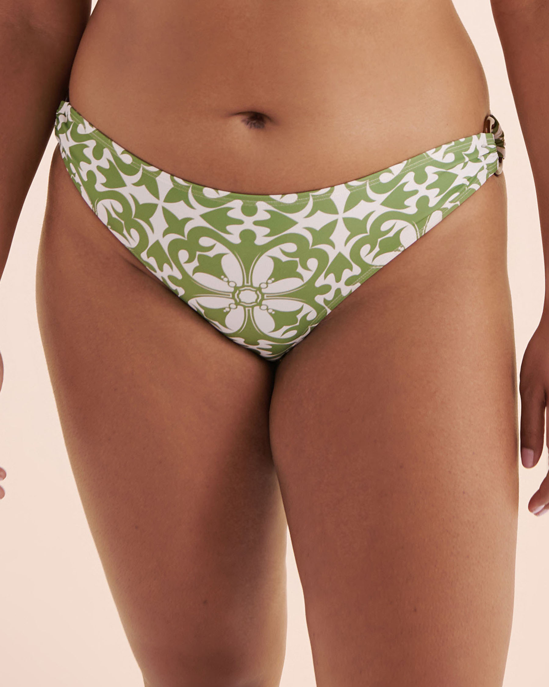 Minimaliste, ce bas de bikini brésilien taille basse sa coupe légèrement échancrée à l’arrière met subtilement en valeur les courbes, tandis que ses côtés ouverts dévoilent juste ce qu’il faut. Son motif mosaïque vert et beige évoque une élégance minérale.
