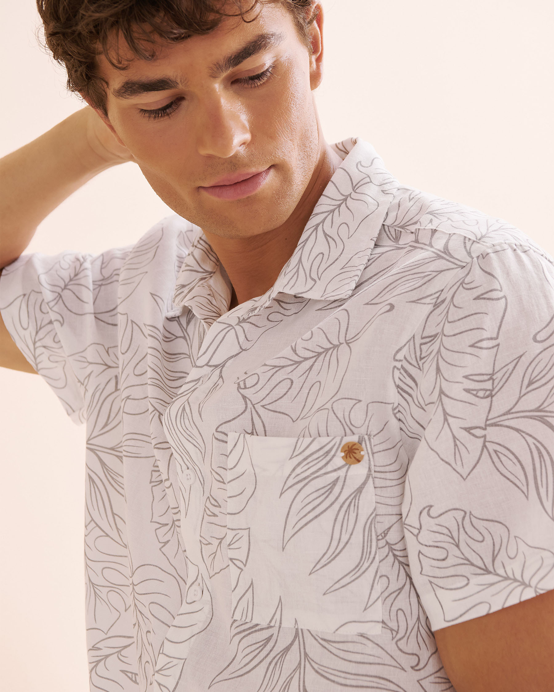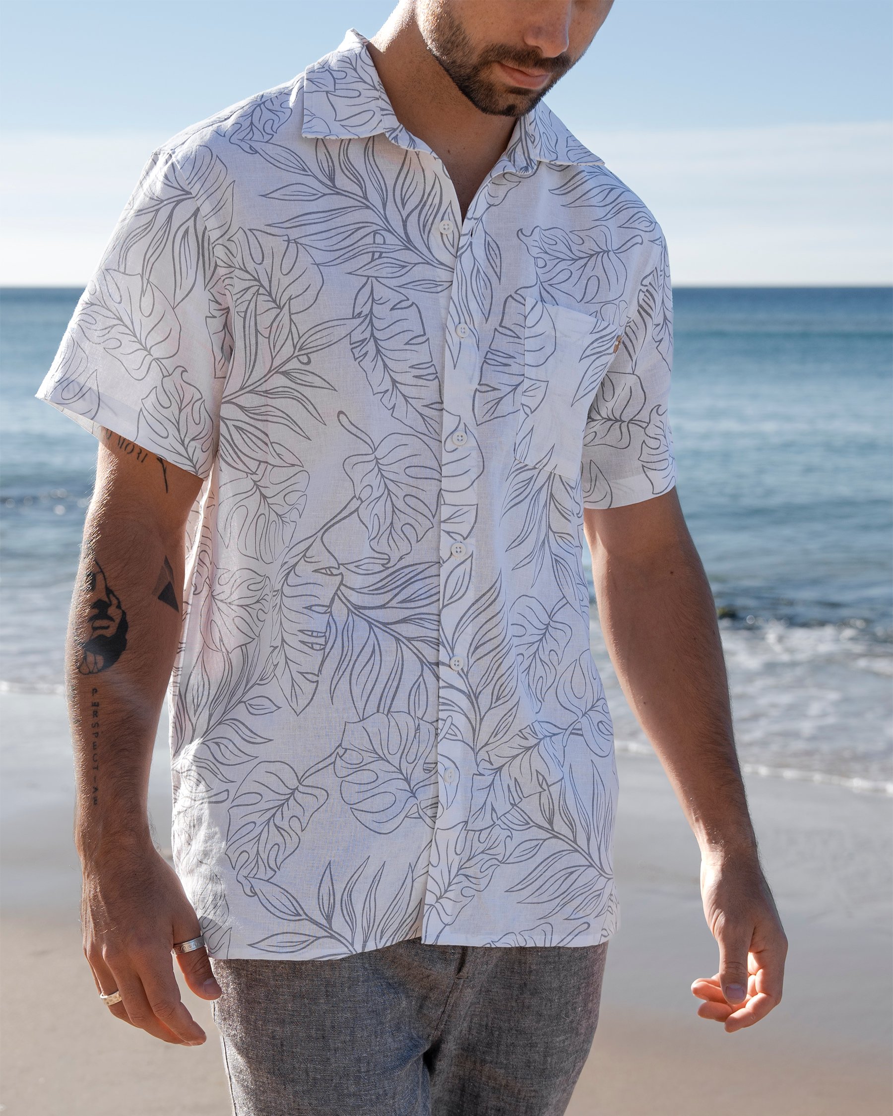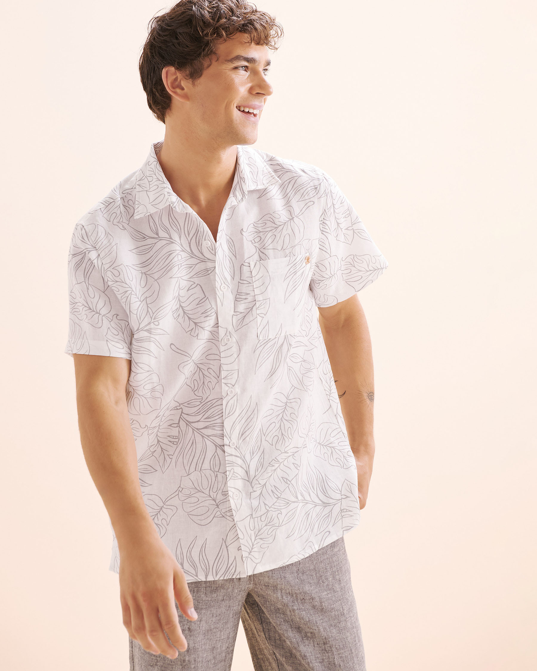 Cette chemise à manches courtes arbore un motif tropical gris qui évoque les vacances, tout en restant élégant. Confectionnée dans un mélange respirant de coton et de lin, elle est idéale pour les journées chaudes. Son encolure boutonnée, sa fermeture à l’avant et sa poche plaquée sont les parfaits détails pour être confortable.