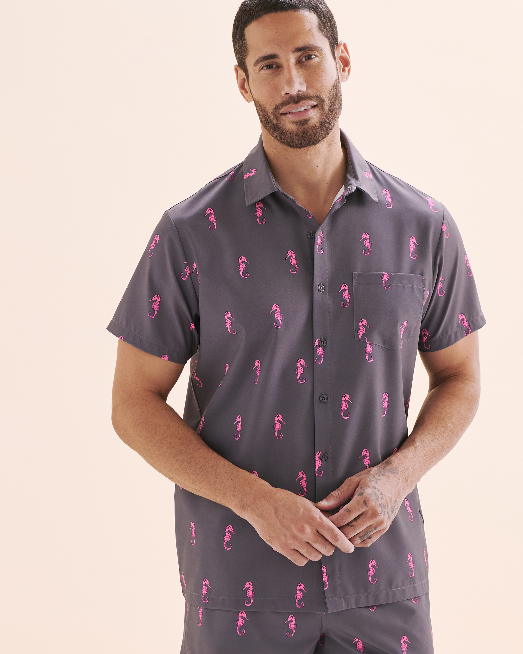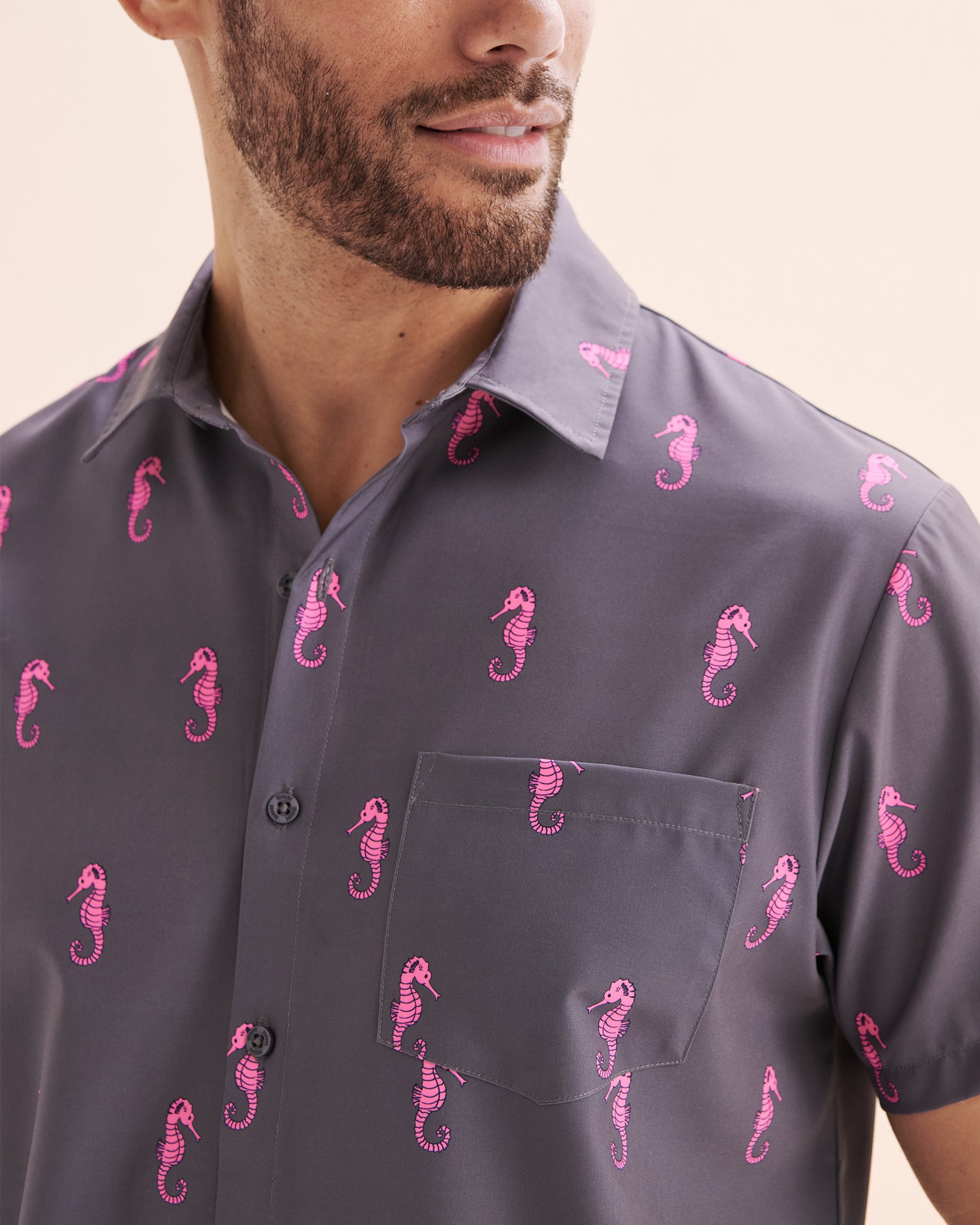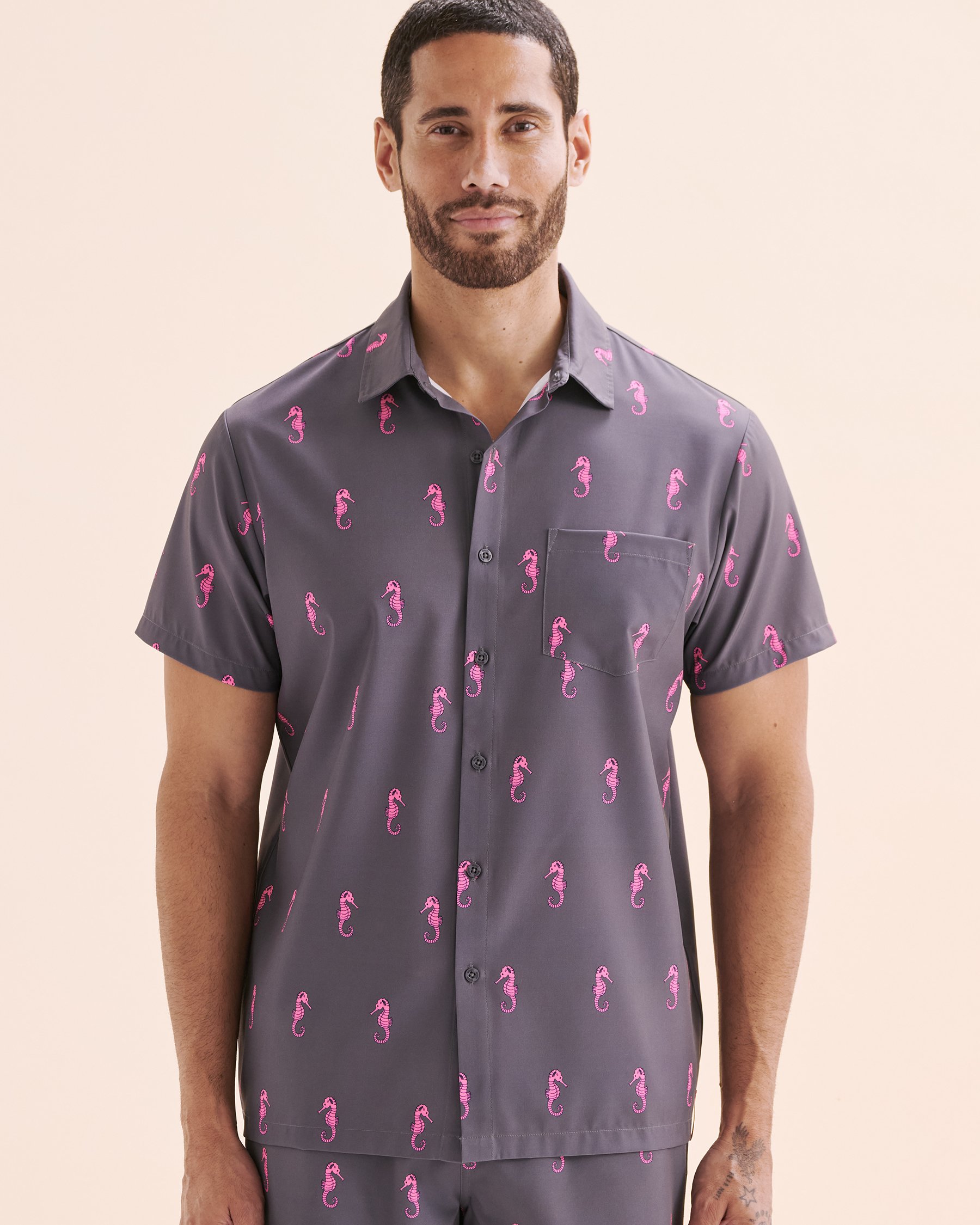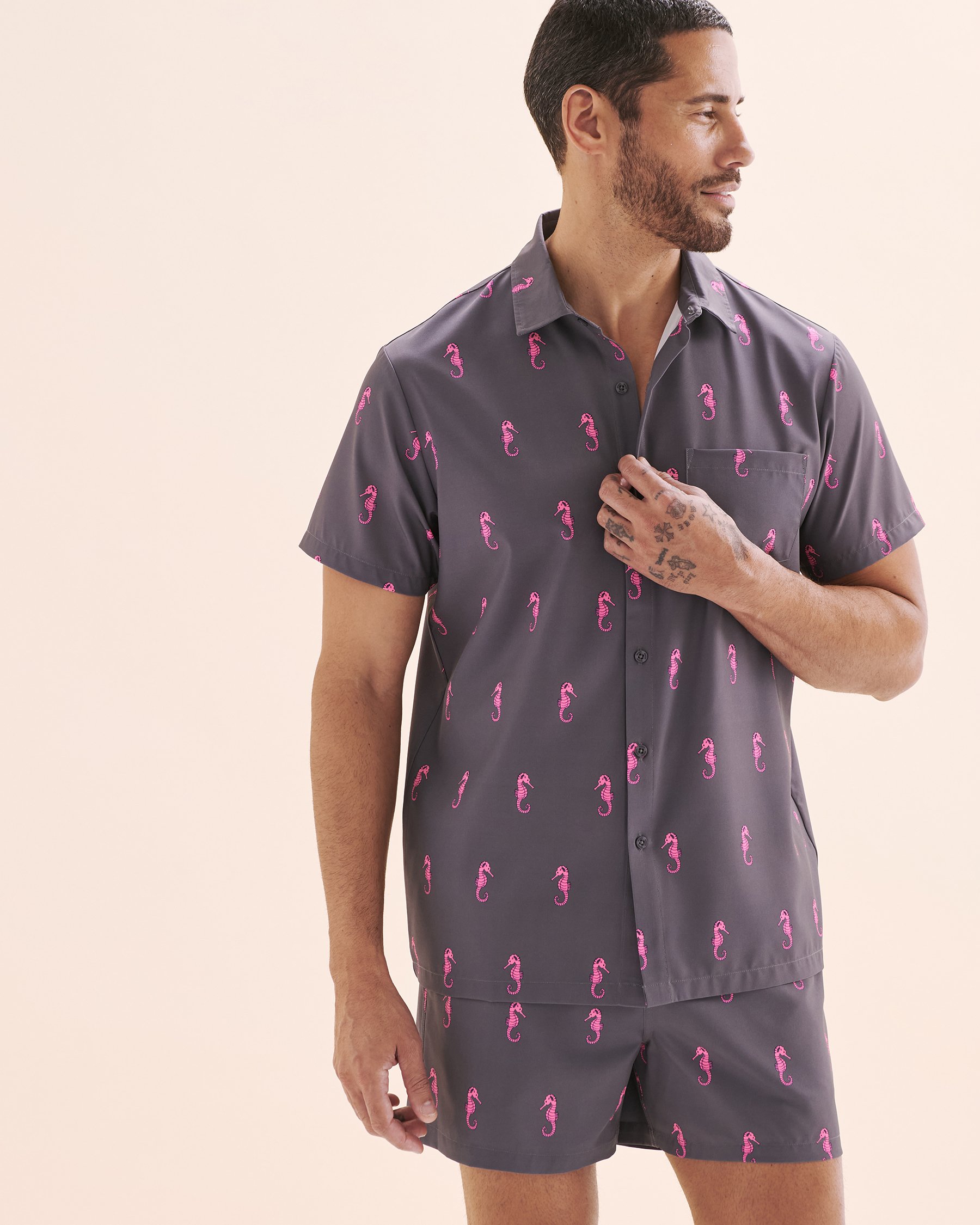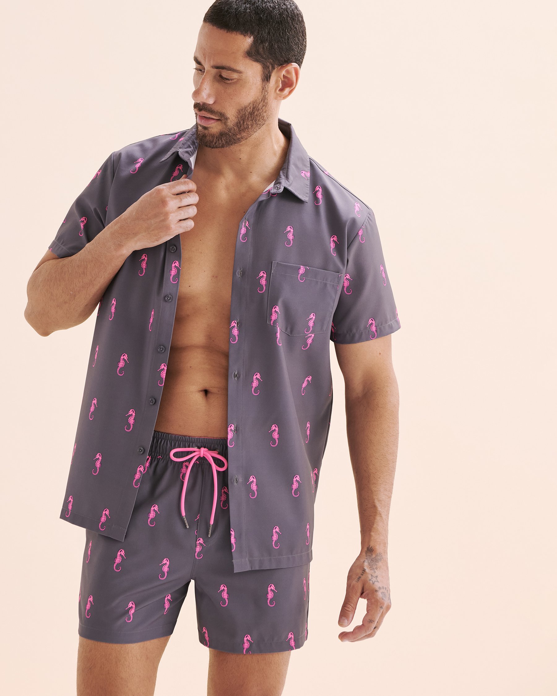 Envie d’un look cool et décontracté qui ne manque pas de dynamisme? Cette chemise gris d'Hamabe est la pièce parfaite pour ajouter une dose de bonne humeur à ta garde-robe ! Avec ses manches courtes légères, son encolure boutonnée, elle s’adapte à toutes tes envies. On fond totalement pour son motif hippocampe rose qui apporte une touche ludique, la signature Hamabe qui fait toute la différence.