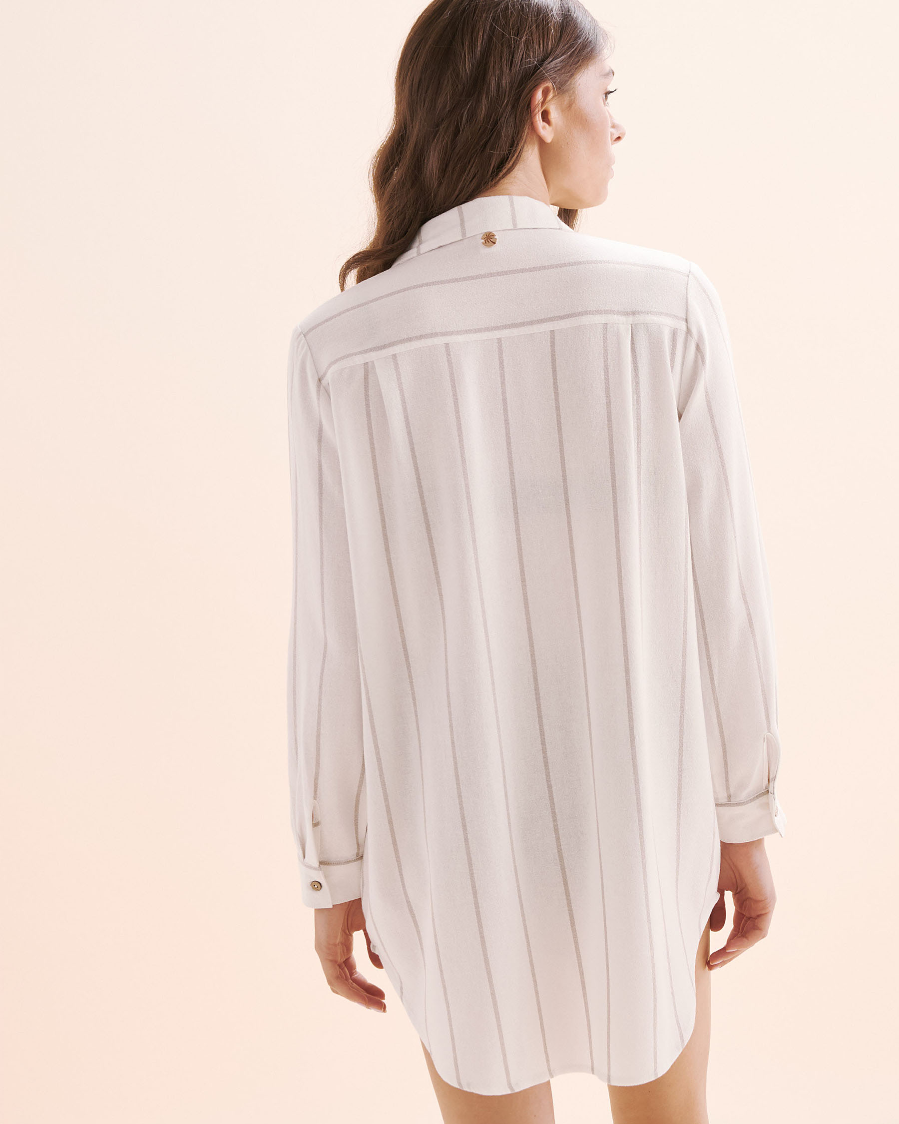 Pour les soirées fraiches ou les brises trop venteuses, cette chemise rayée blanc et beige pourra se glisser dans votre sac pour vous protéger du soleil comme du vent. Légère, elle sera parfaite dans toute condition et ne prendra jamais trop de place dans une valise.