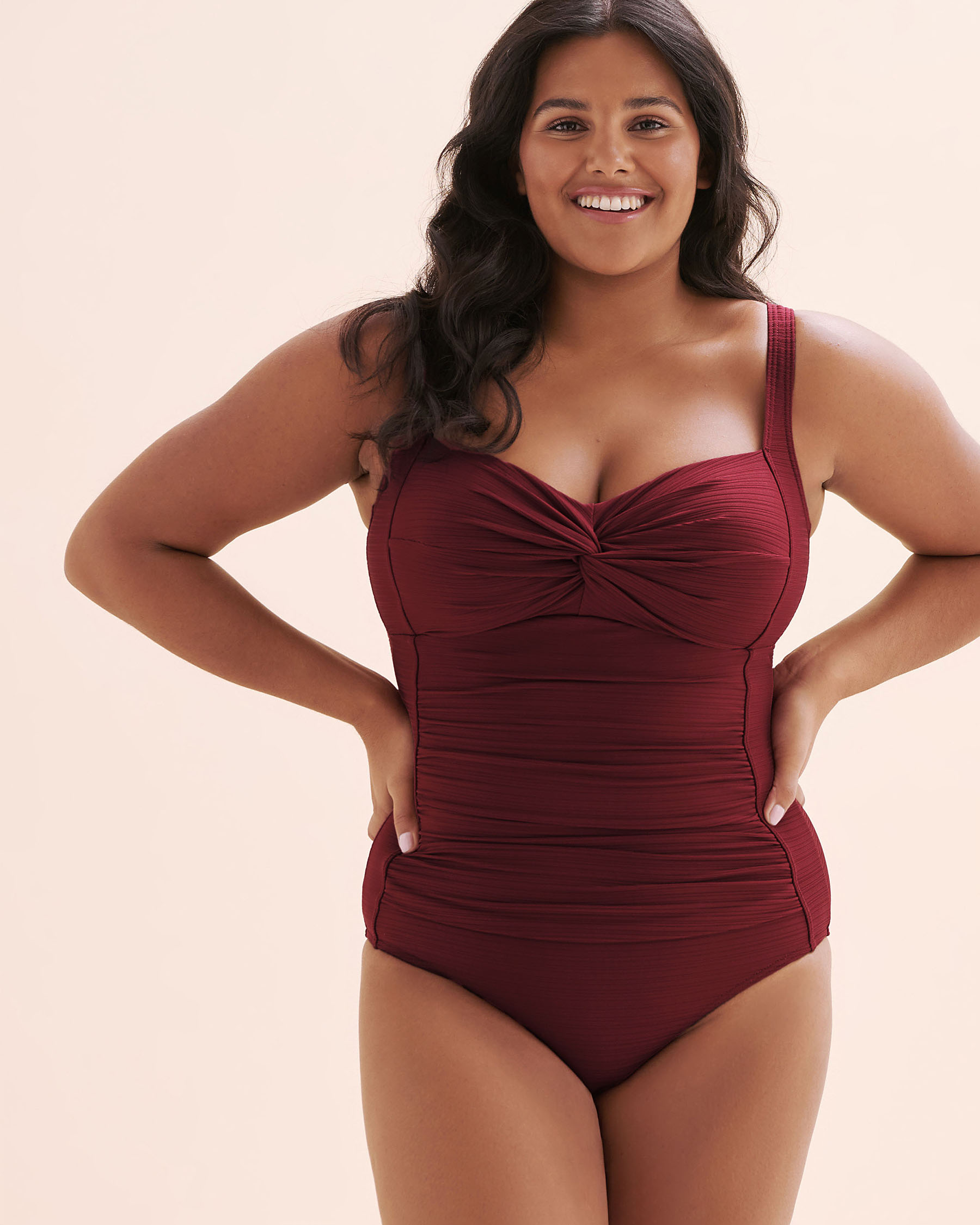 Faites sensation avec ce maillot une-pièce au charme intemporel ! Ses bonnets intégrés et son soutien-gorge intégré assurent un maintien parfait, tandis que le devant torsadé en boucle sculpte la silhouette avec style. Sa doublure en filet gainant et sa couverture complète à l’arrière garantissent confiance. Le tout dans un rouge grenat intense, pour un look glamour.