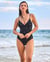 Ce maillot une-pièce est votre passeport pour un style raffiné. Avec son dos à nouer et son décolleté plongeant, il vole la vedette à chaque apparition, tandis que la coupe brésilienne et la couverture arrière échancrée mettent en valeur votre silhouette avec subtilité. Son motif floral rose, délicatement dispersé sur un fond noir, apporte une touche naturelle.