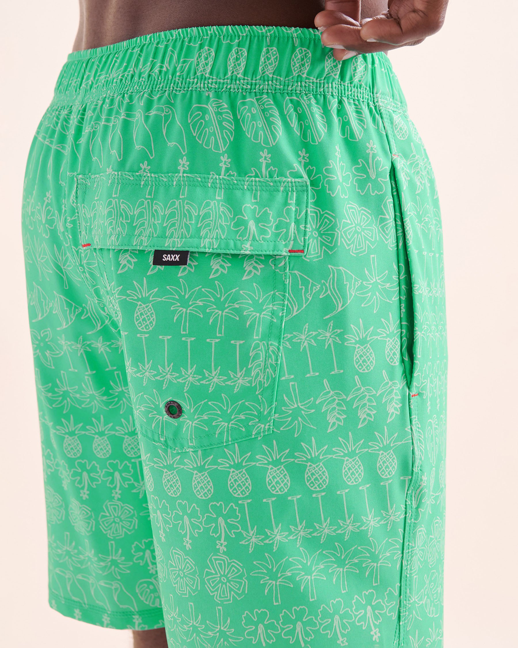 Le short volley 2 en 1 Oh Buoy est bien plus qu’un simple maillot : c’est votre passeport pour des aventures aquatiques sans limites. Conçu avec un tissu extensible 4 directions, il vous offre une liberté de mouvement totale. Sa doublure compressive courte et sa technologie de refroidissement vous gardent au frais toute la journée, en plus d'être résistantes au chlore et à l’eau salée. Ajoutez à cela des poches à drainage rapide avec boucle de sécurité pour clé et vous obtenez le combo parfait. Son motif exotique blanc et vert apporte la touche tropicale qui fera tourner les têtes.
