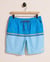 Imprimé feuillage bleu sur la moitié du short, rayures bleues et orange au milieu et bleu uni sur l'autre moitié