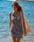 Cette robe bleue munie d'un motif floral blanc est le choix parfait pour un look élégant. Cette robe courte sans manches avec un col en V flatteur offre un confort optimal grâce à son tissu léger. L’ajustement personnalisé est assuré par les cordons de serrage latéraux, tandis que les extrémités du lien sont ornées de cylindres métalliques pour une touche subtile de raffinement.