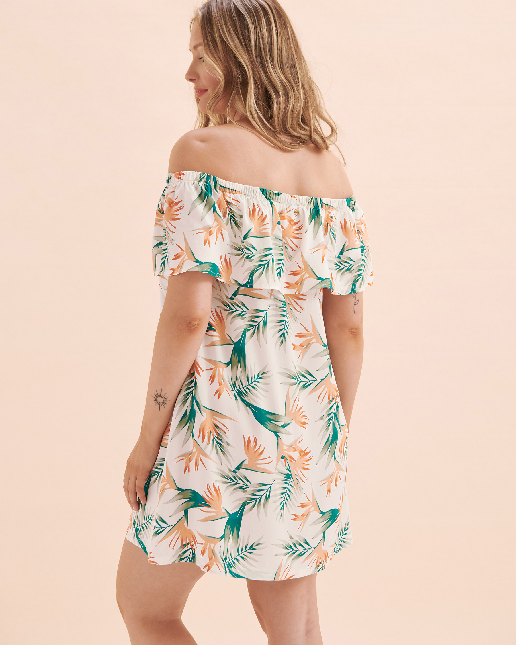 Avec son imprimé tropical éclatant et ses épaules décolletées, cette robe est parfaite pour prendre le soleil avec style.