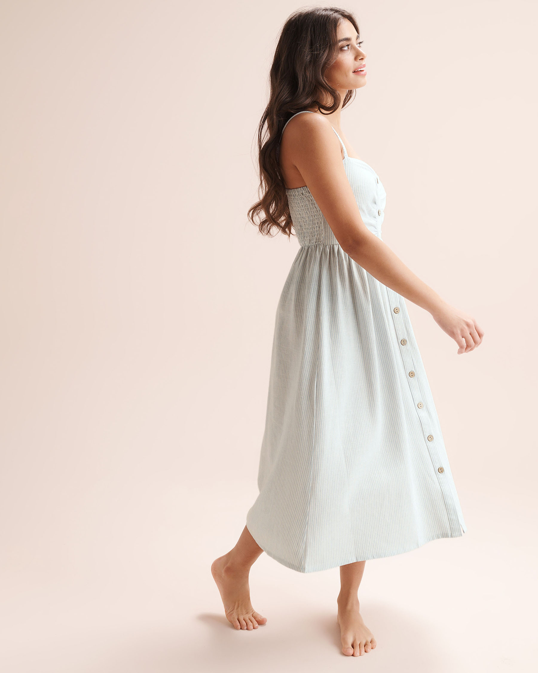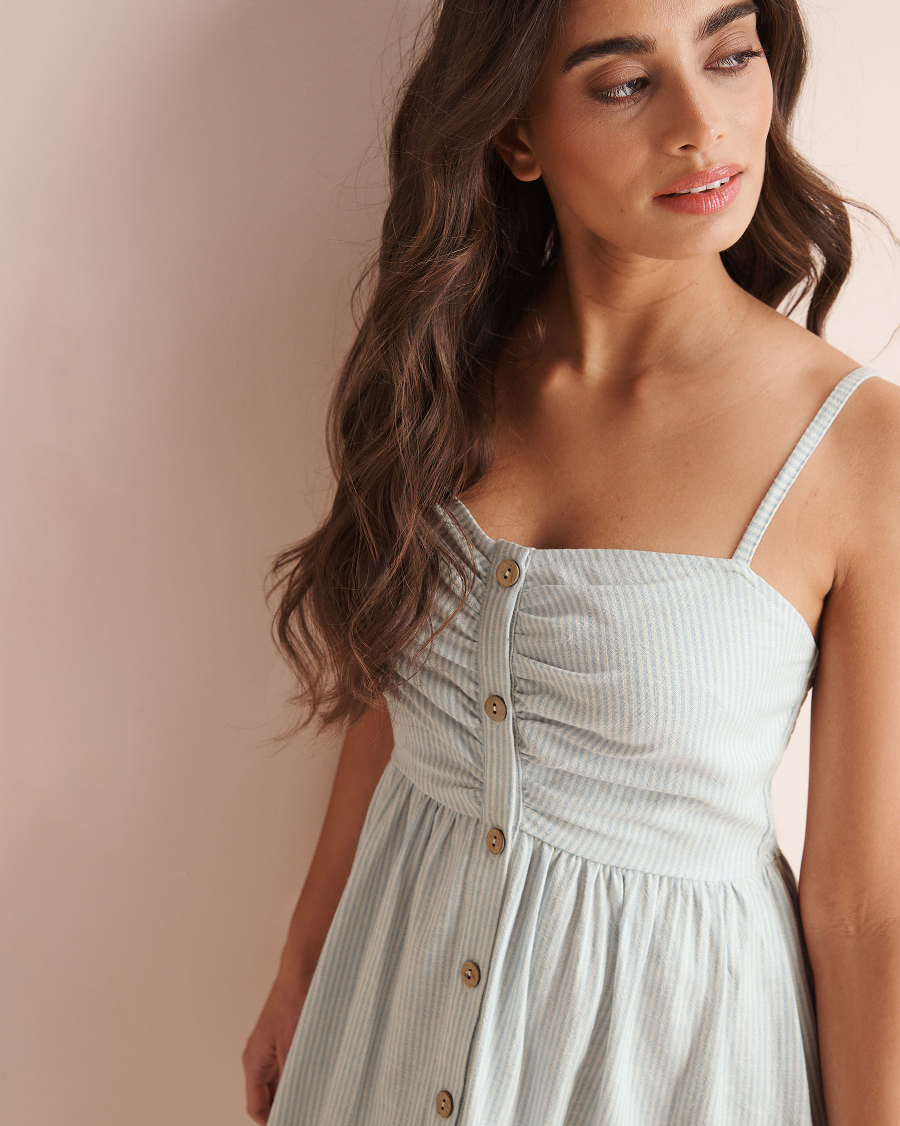 Vous cherchiez la robe parfaite pour les temps chauds ou vos prochaines vacances ? Cette robe répondra à cette demande ! Boutonnée sur le devant avec des boutons en fibre de coco, c'est la petite touche balnéaire qu'il fallait à ce design versatile. Avec son motif de rayures blanches et bleues, elle vous accompagnera dans les rues de la ville ou sur les plages de sables fins.