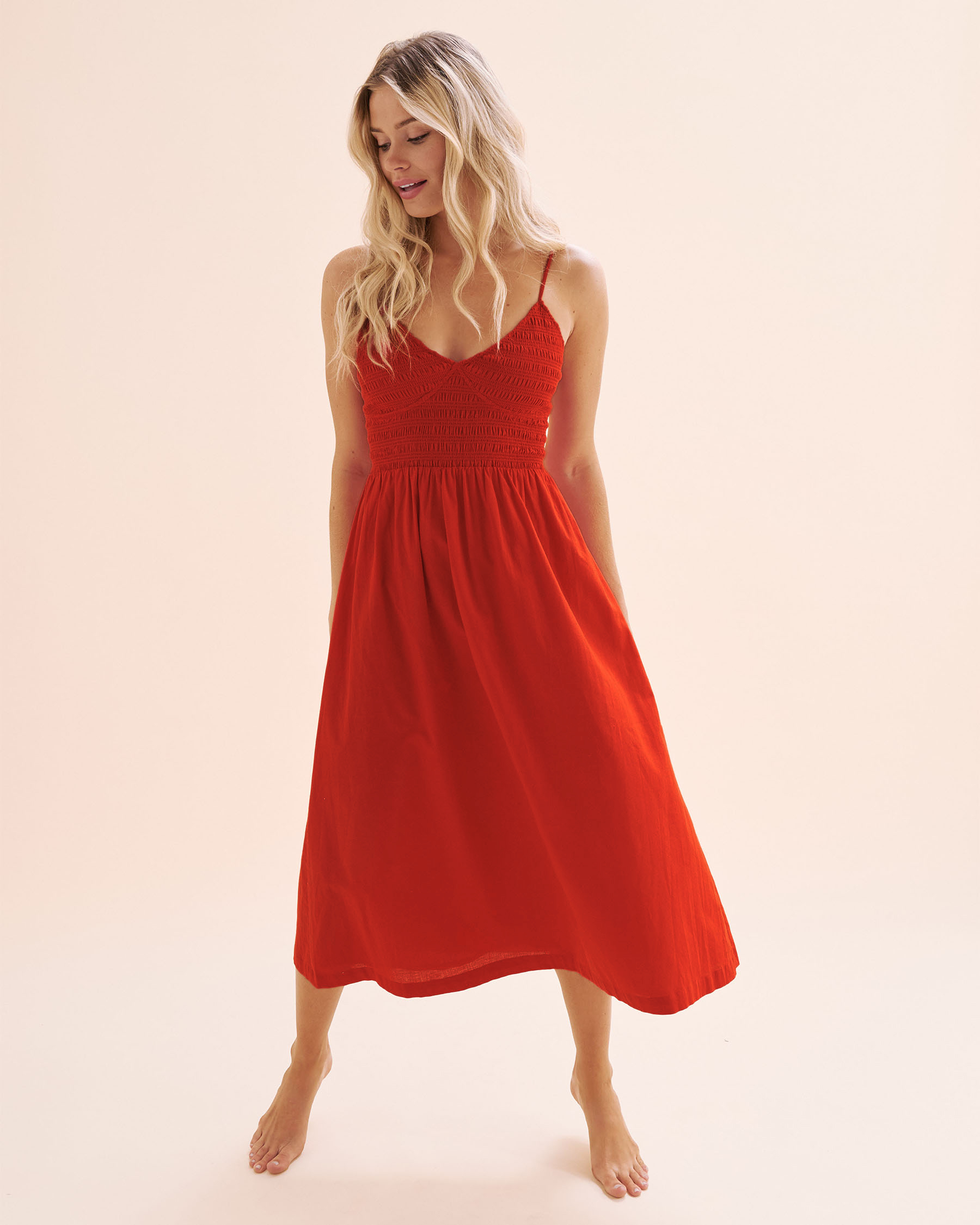 Imaginez une journée ensoleillée, un vent léger qui caresse votre peau et cette robe qui vous accompagne dans chaque mouvement. Sa coupe midi sans manches, son encolure en V et son corsage smocké ajusté dessinent une silhouette féminine, tandis que ses bretelles ajustables s’adaptent à votre confort. La jupe fluide danse au rythme de vos pas, que vous flâniez dans les ruelles d’une ville inconnue ou que vous profitiez d’un coucher de soleil sur la plage. Avec sa couleur rouge éclatante, elle incarne la passion, la liberté et l’envie de découvrir.