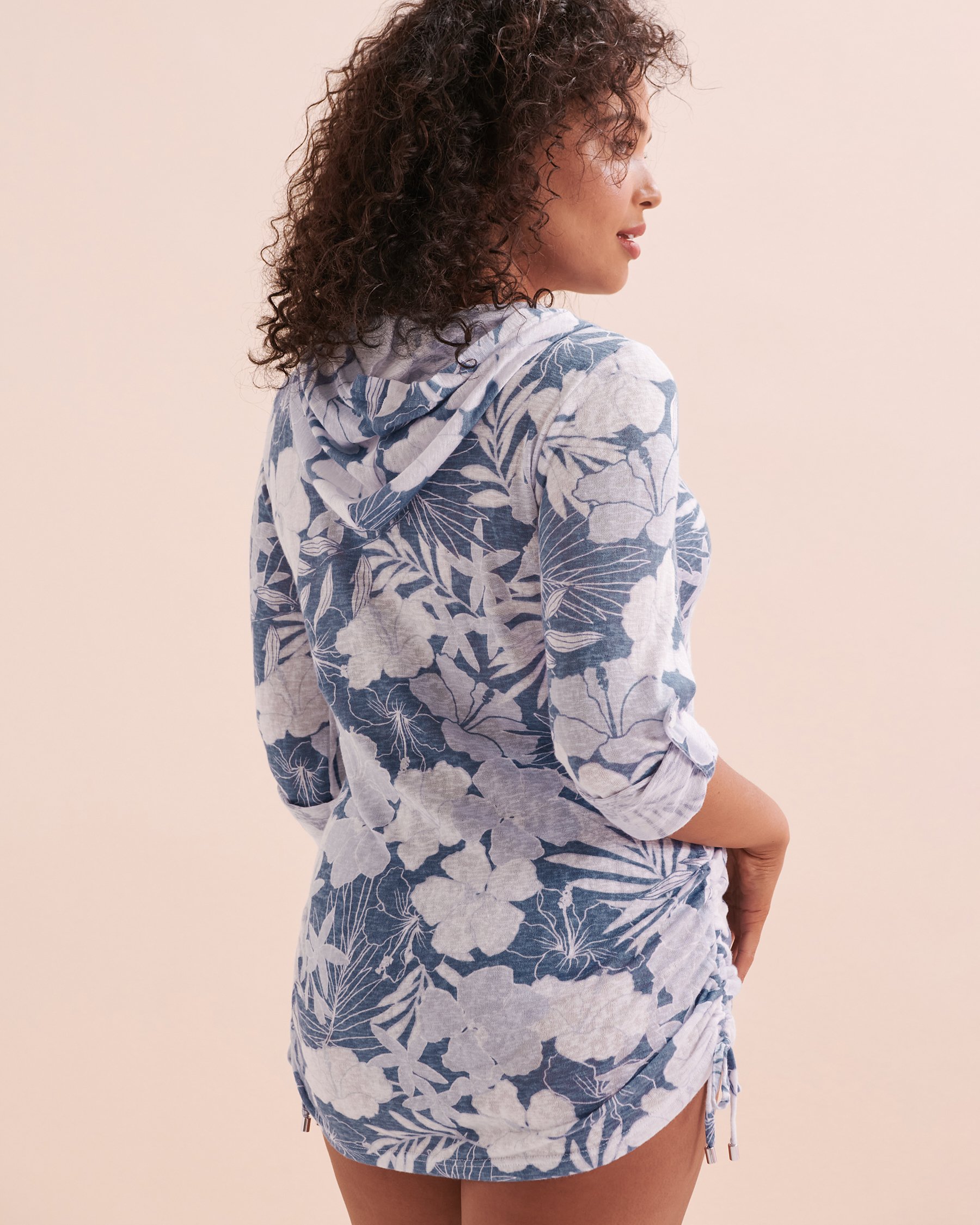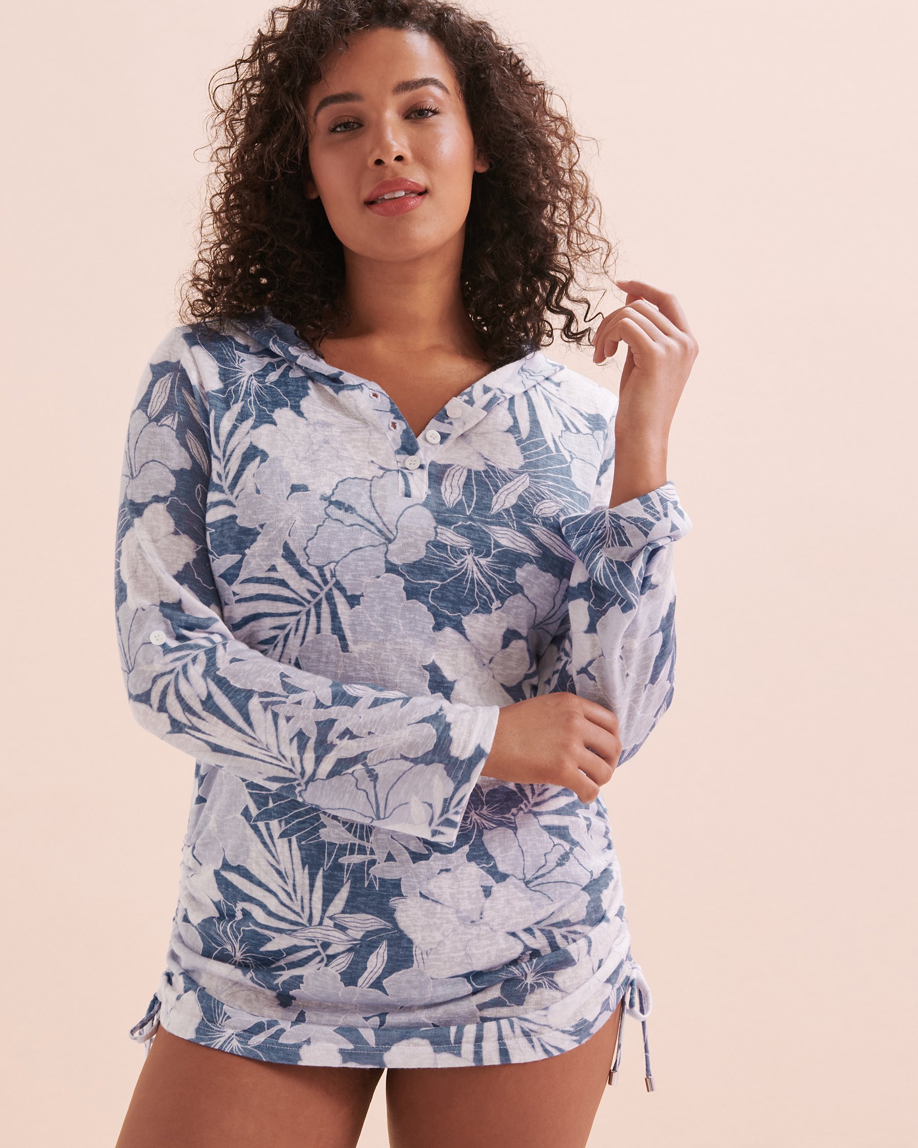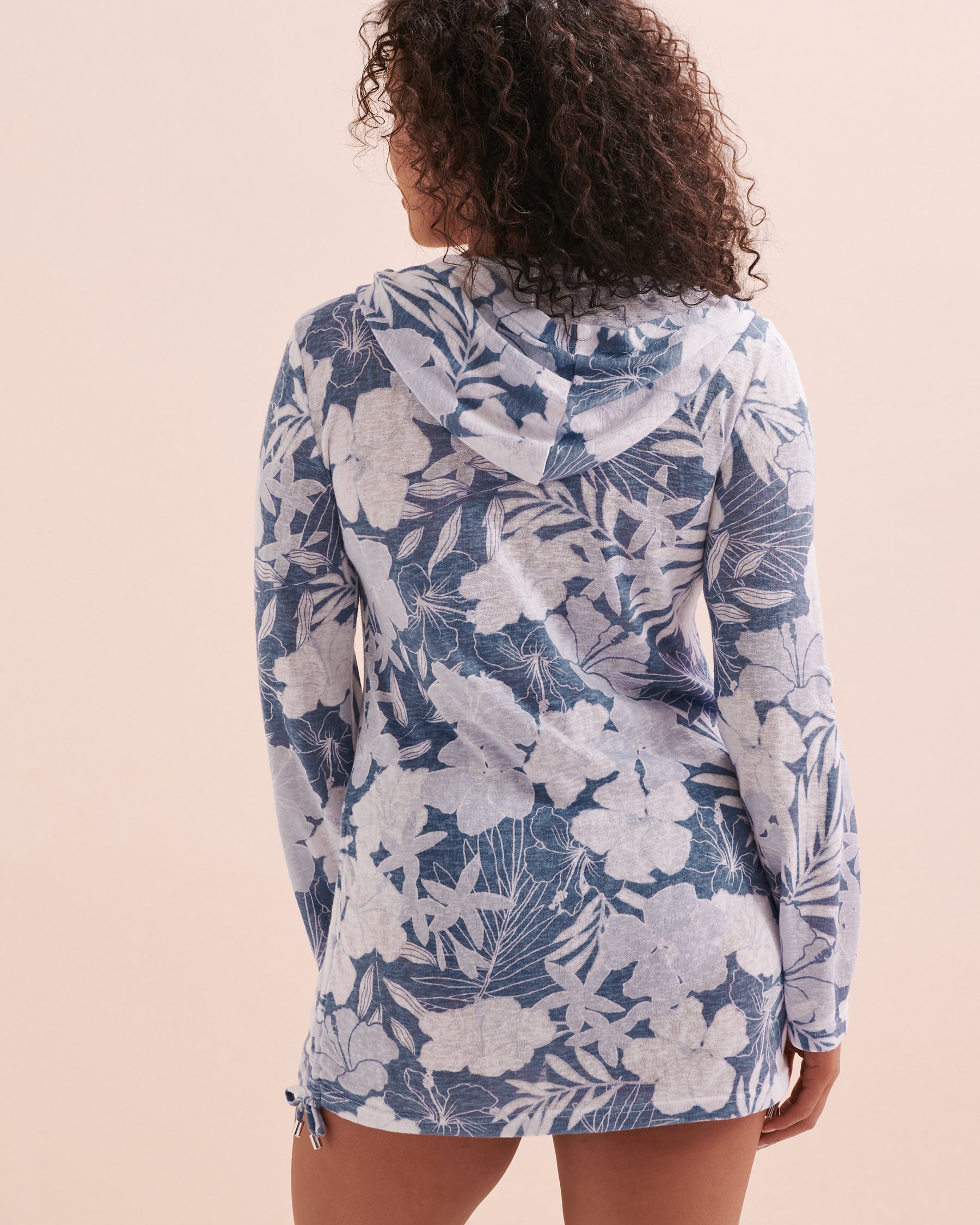 Enfilez la tunique à capuchon d'Eau de Sea pour commencer vos vacances à la mode. Cet habit, décoré d'un imprimé fleuri bleu, est parfait pour mettre par-dessus un maillot, ou même pour un souper sur une terrasse. Ses manches longues rétractables et ses cordons ajustables sur les côtés vous assureront un confort garanti, ainsi que de modifier la tenue à votre gout.