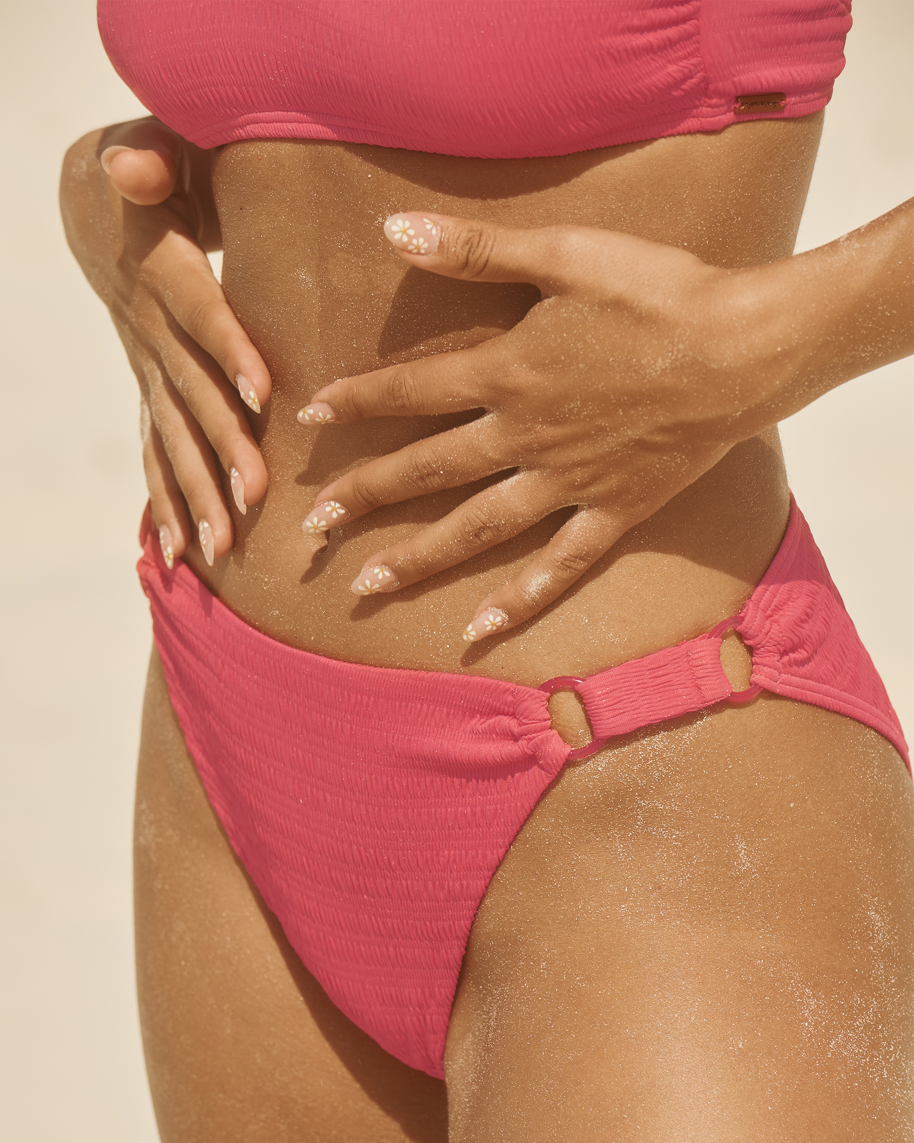 The Brazilian Cheeky bikini bottoms by My Bikini Story are the ones for you! These bright pink bottoms are made of a textured material. Their mid-rise cut and cheeky bum coverage is guaranteed to flatter you. The side ring details add an extra level of detailing and style. Match these with My Bikini Story's Bralette Bahamas top to complete the set.
