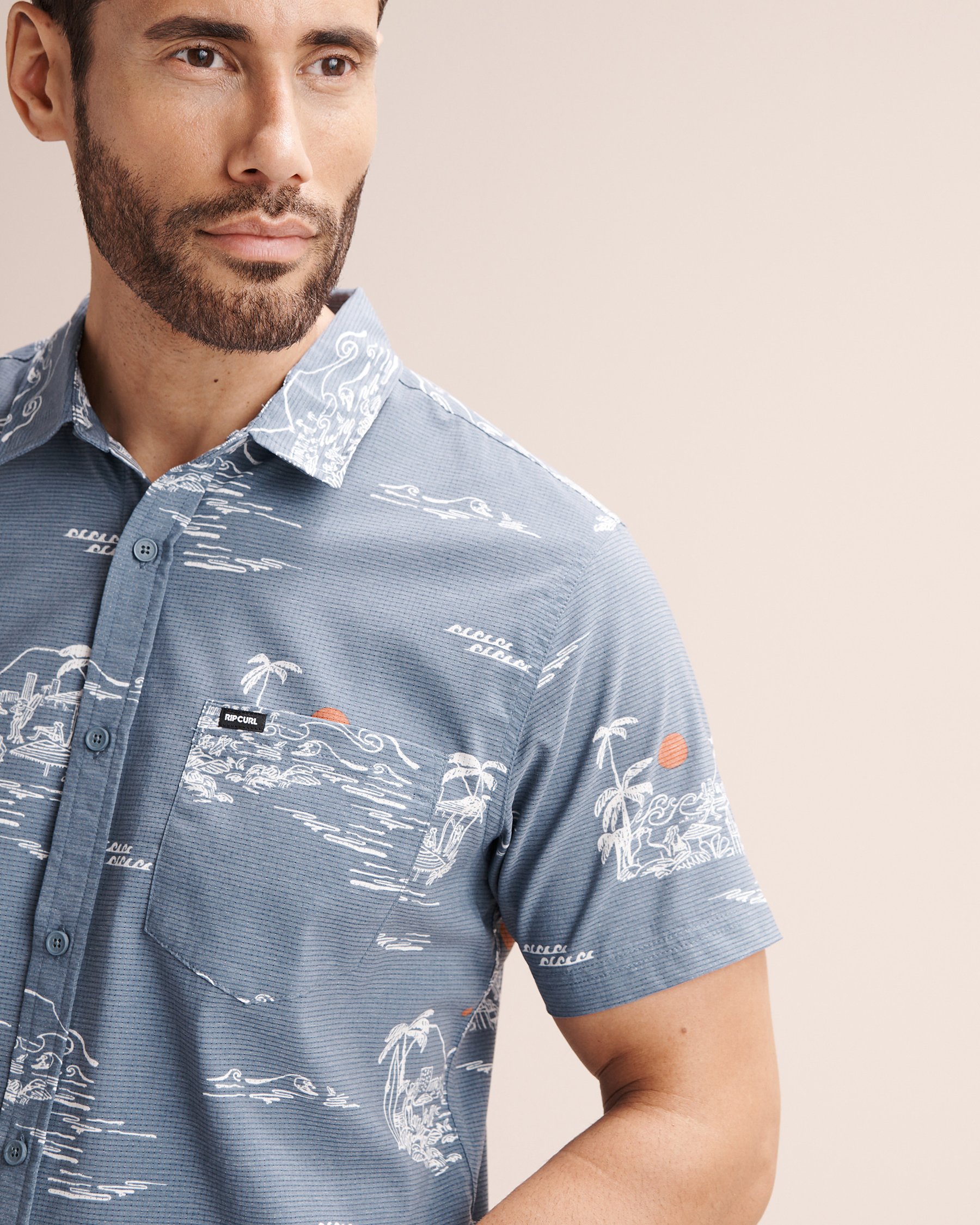 Set sail for adventure with this lightweight, breathable shirt that takes you from the seaside to the marina terrace. Its short sleeves and standard fit ensure a relaxed look, while the button-front closure and chest pocket add a practical touch. Thanks to its quick-dry fabric and moisture-wicking technology, you’ll stay a little cooler, even under tropical skies. The white and brown tropical island pattern is a nod to escape, perfect for showing off your fun, travel-ready spirit.