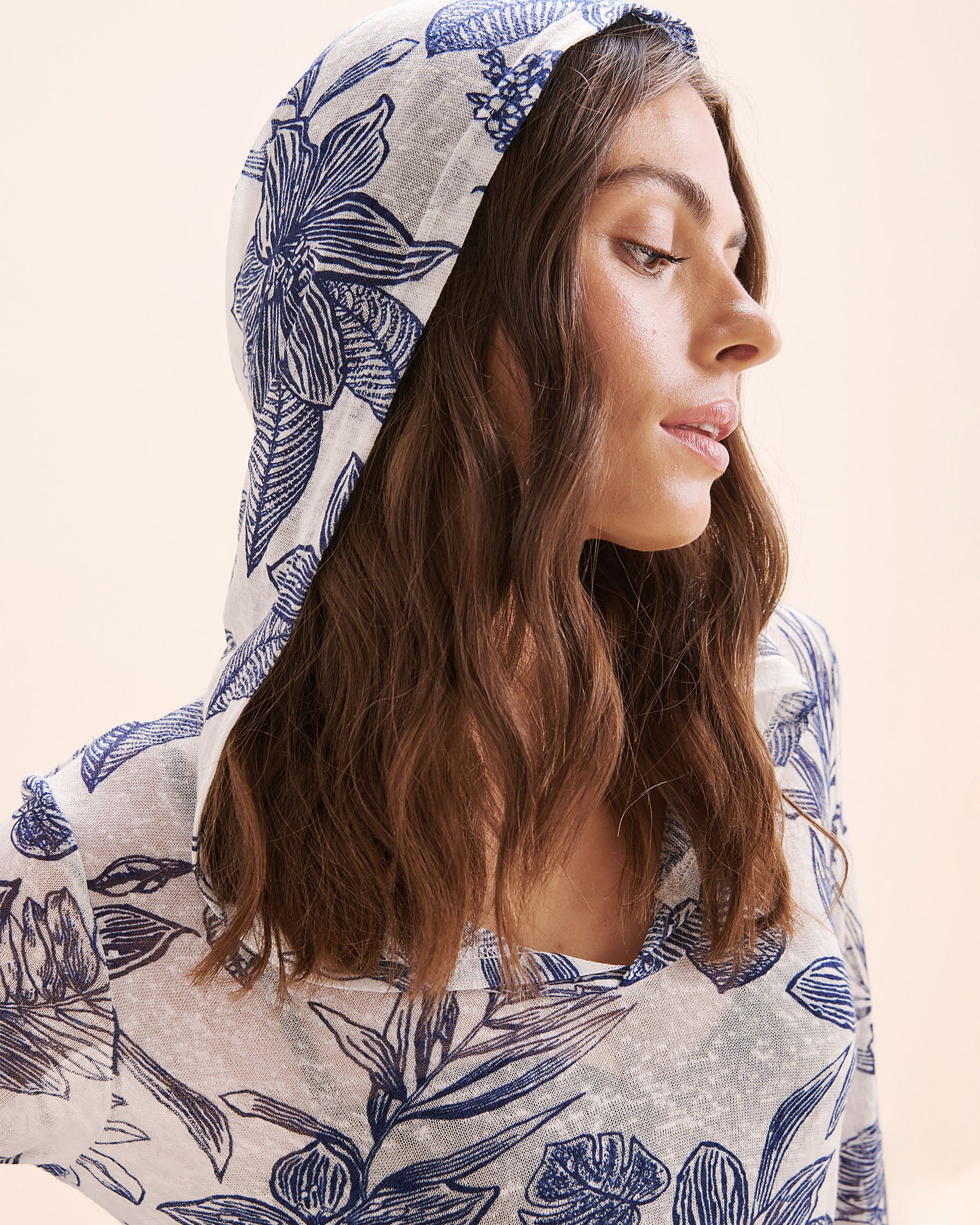 The Hacci Hooded Tunic is the perfect piece with its long sleeves, practical hood and side slits. Its lightweight white fabric with a delicate blue floral pattern evokes a subtle connection to nature, while adding an elegant touch to your look.