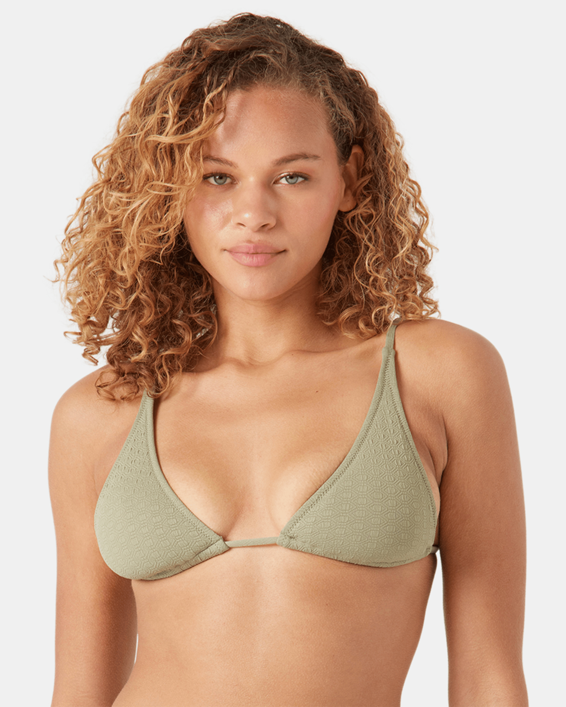 The Haleiwa bikini top by Roxy checks all the boxes of the perfect triangle: a flattering V‑neckline, light support and adjustable ties at the neck and back. Made from textured fabric, it follows you to every beach around the world, whether you’re tanning, swimming or sipping a smoothie with your feet in the sand. Its green color enhances your tan and highlights your sun‑kissed energy.