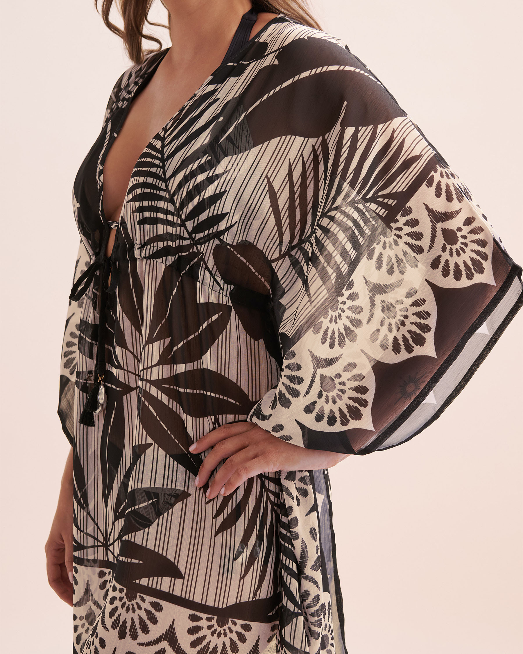 Let yourself be charmed by the lightness and refinement of the Island Time caftan. Crafted from airy chiffon, it stands out with its elbow-length short sleeves and deep V-neckline, perfect for showcasing your swimsuit. The adjustable waist drawstring ensures an elegant fit, while its black foliage pattern, enhanced with a lace-inspired decorative trim, creates a sophisticated look.