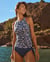 This high-neck tankini top brings a fresh take on elegance with a modern, structured twist. Integrated padding offers a naturally contoured shape, while the lace-up back with a decorative metal ring adds a delicate graphic touch. Easy to slip on and lined with breathable mesh for added comfort, this piece is finished with a soft white floral print and a ribbed fabric that enhances your silhouette with a subtle texture.