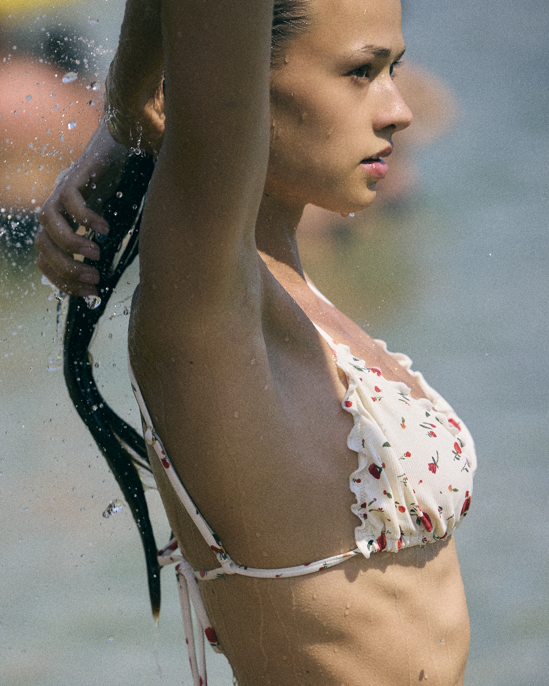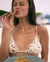 This white bikini top delicately blends a red and green floral pattern with a clean, minimalist cut. Wireless and equipped with removable pads, it ensures natural comfort. The back tie and frill edge details enhance its ribbed texture with a feminine finish.