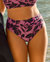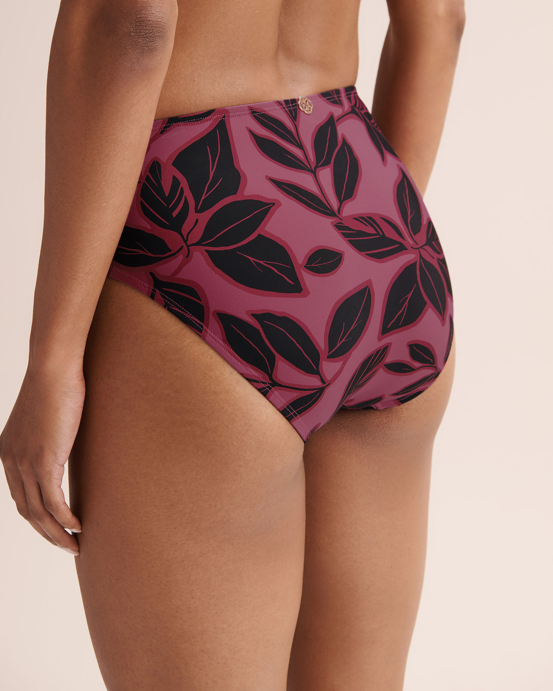 This mid-waist bikini bottom in a black and violet floral pattern is the piece that elevates your style with refined elegance. Its ruched waistband adds a feminine touch, while the classic bikini cut keeps the look timeless. With full back coverage and full lining with mesh support at the waist, it offers optimal comfort and hold, perfect whether you're soaking up the sun or taking a swim.