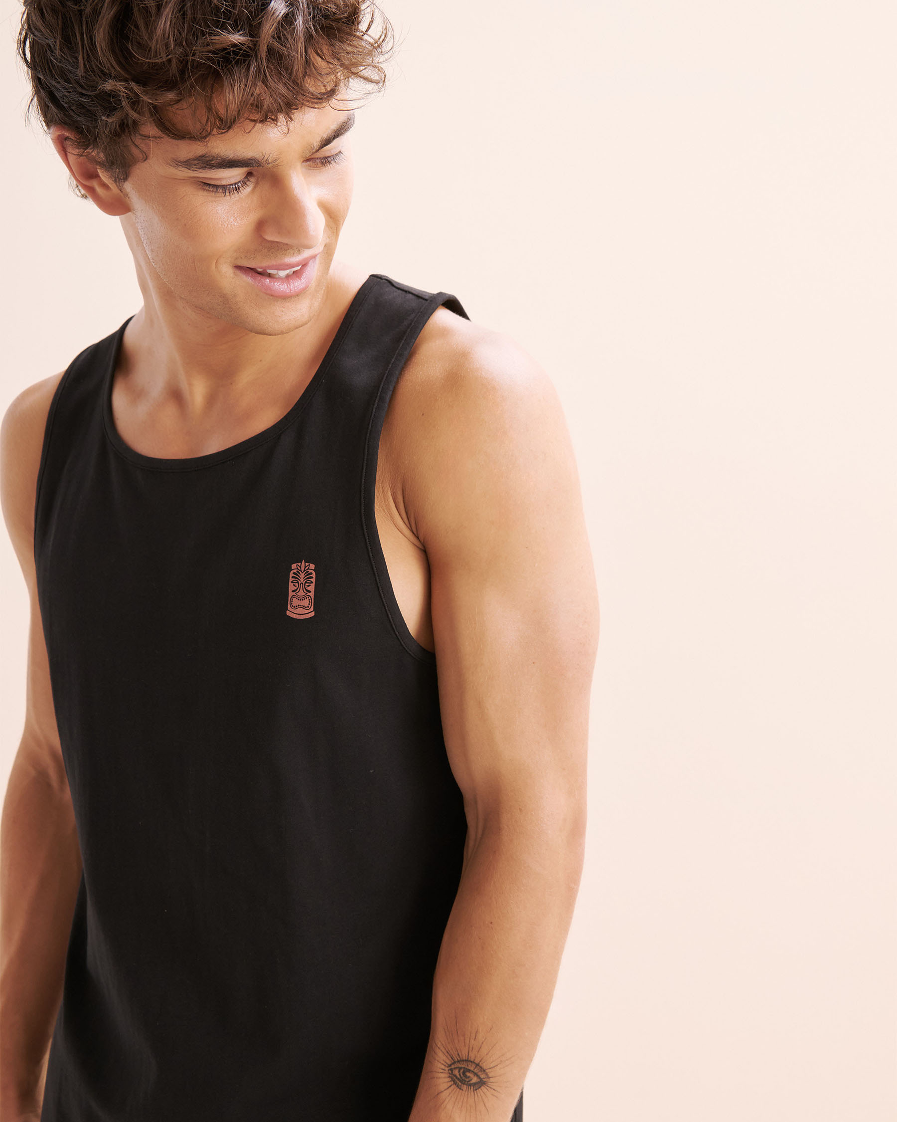 A tropical breeze blows through your style with this black tank top. U-neck, sleeveless cut and a brown Tiki print for a look that truly stands out.