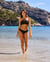 This textured smocked bralette bikini top is your new secret weapon for a chic look. Its sophisticated high neckline, paired with a front keyhole detail, creates an elegant silhouette. The textured fabric adds depth and dimension to its classic black color.