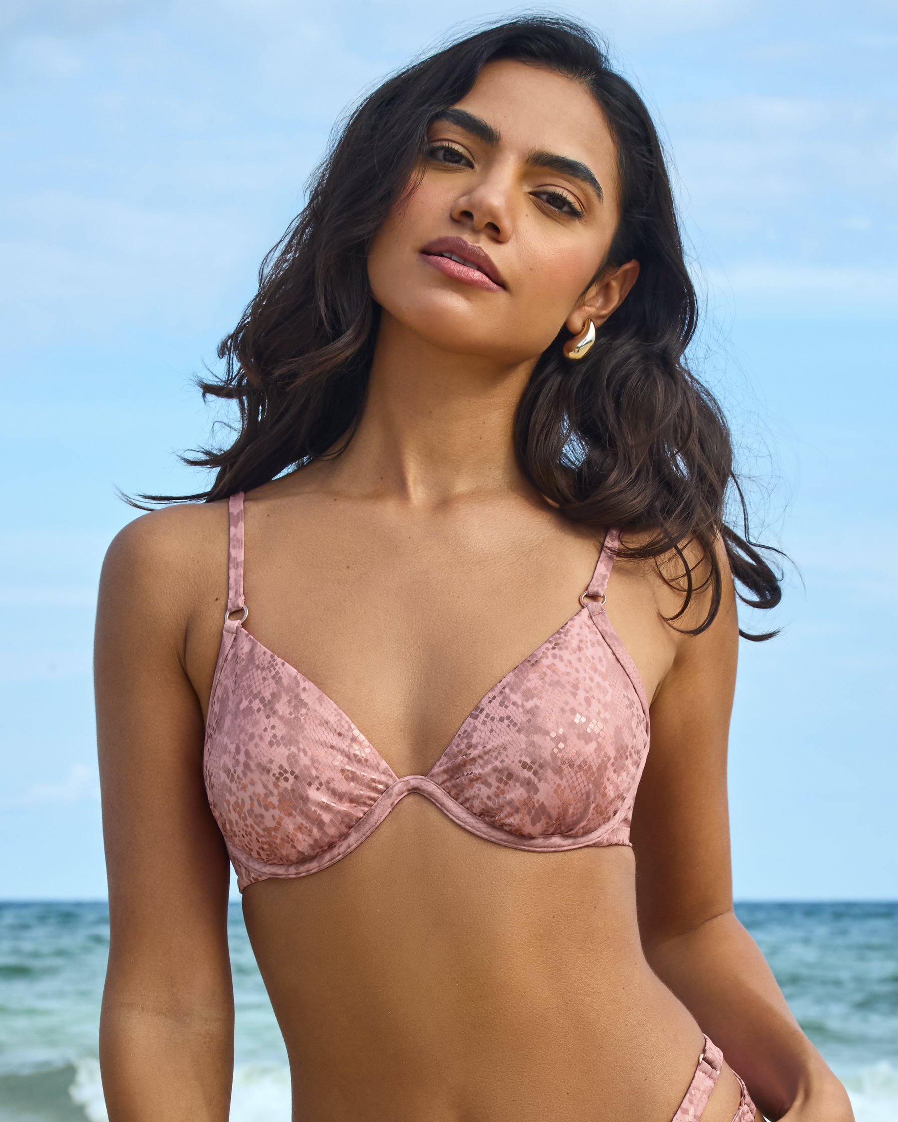 Step into the urban jungle with this bikini top featuring a snakeskin effect, enhanced by golden accents that highlight its delicate blush-pink hue. Its underwire provides perfect support, while the plunging neckline reveals your wild side with elegance.